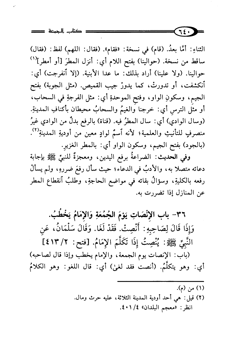 الثناءِ: أمَّا بعدُ. (قام) في نسخة: "فقام". (فقال: اللهم) لفظ: (فقال) ساقط من نسخة. (حوالينا) بفتح اللام أي: أنزل المطرَ [أو أمطر] (¬1) حوالينا. (ولا علينا) أراد بذلك: ما عدا الأبنية. (إلا انفرجت) أي: انكشفت، أو تدورتْ، كما يدور جيب القميص. (مثل الجوبة) بفتح الجيمِ، وسكونِ الواو، وفتحِ الموحدةِ أي: مثل الفرجةِ في السحاب، أو مثل الترسِ أي: خرجنا والغيمُ والسحابُ محيطان بأكنافِ المدينةِ. (وسال الوادي) أي: سال المطرُ فيه. (قناة) بالرفع بدل من الوادي غيرُ منصرف للتأنيثِ والعلمية؛ لأنه اسمٌ لوادٍ معين من أوديةِ المدينةِ (¬2). (بالجود) بفتح الجيم، وسكون الواو أي: بالمطر الغزيرِ.