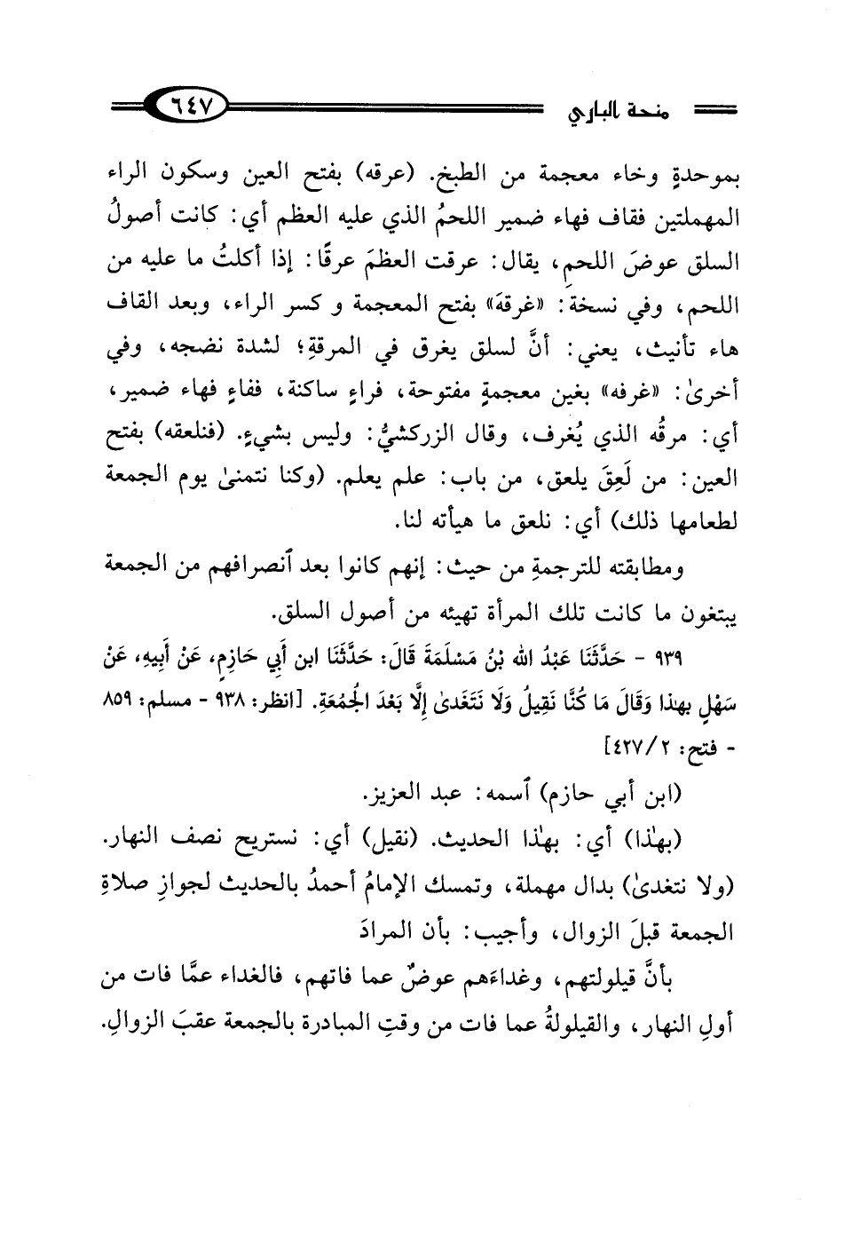 939 - حَدَّثَنَا عَبْدُ اللَّهِ بْنُ مَسْلَمَةَ، قَال: حَدَّثَنَا ابْنُ أَبِي حَازِمٍ، عَنْ أَبِيهِ، عَنْ سَهْلٍ، بِهَذَا، وَقَال: "مَا كُنَّا نَقِيلُ وَلَا نَتَغَدَّى إلا بَعْدَ الجُمُعَةِ".