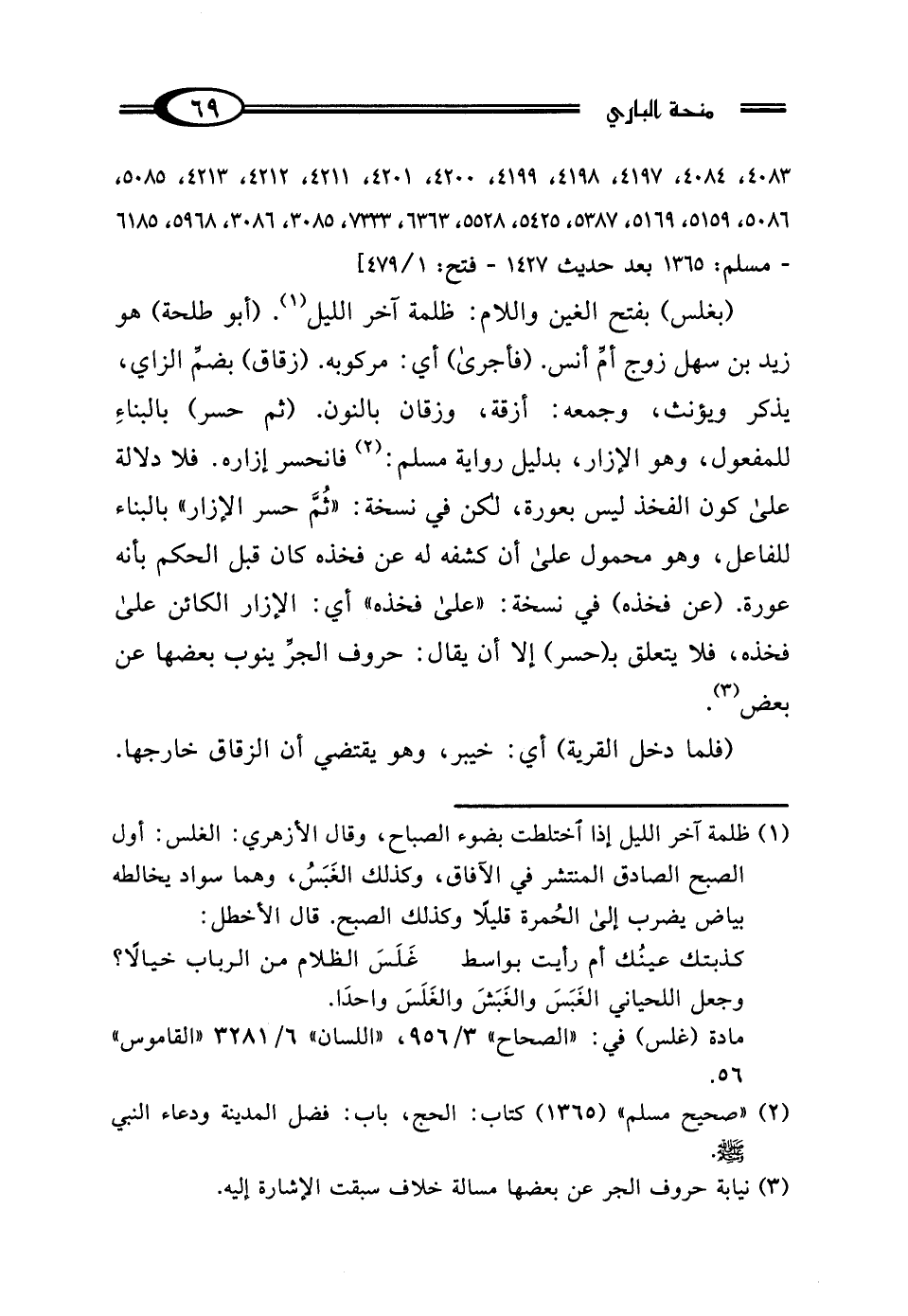 (بغلس) بفتح الغين واللام: ظلمة آخر الليل (¬1). (أَبو طلحة) هو زيد بن سهل زوج أُمِّ أنس. (فأجرى) أي: مركوبه. (زقاق) بضمِّ الزاي، يذكر ويؤنث، وجمعه: أزقة، وزقان بالنون. (ثم حسر) بالبناءِ للمفعول، وهو الإزار، بدليل رواية مسلم: (¬2) فانحسر إزاره. فلا دلالة علي كون الفخذ ليس بعورة، لكن في نسخة: "ثُمَّ حسر الإزار" بالبناء للفاعل، وهو محمول على أن كشفه له عن فخذه كان قبل الحكم بأنه عورة. (عن فخذه) في نسخة: "على فخذه" أي: الإزار الكائن علي فخذه، فلا يتعلق بـ (حسر) إلا أن يقال: حروف الجرِّ ينوب بعضها عن بعض (¬3).