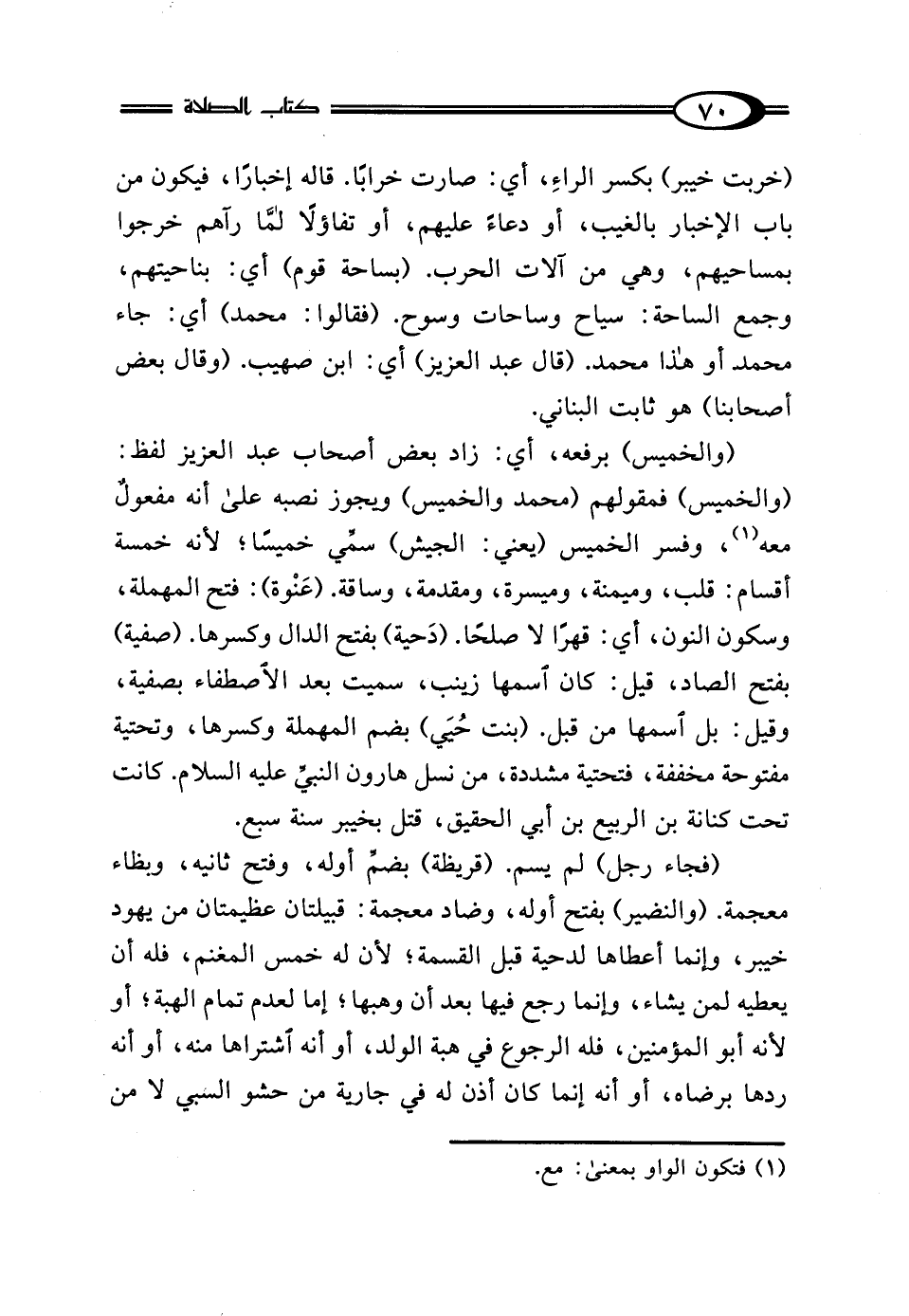 (والخميس) برفعه، أي: زاد بعض أصحاب عبد العزيز لفظ: (والخميس) فمقولهم (محمد والخميس) ويجوز نصبه على أنه مفعولٌ معه (¬1)، وفسر الخميس (يعني: الجيش) سمِّي خميسًا؛ لأنه خمسة أقسام: قلب، وميمنة، وميسرة، ومقدمة، وساقة. (عَنْوة): فتح المهملة، وسكون النون، أي: قهرًا لا صلحًا. (دَحية) بفتح الدال وكسرها. (صفية) بفتح الصاد، قيل: كان اسمها زينب، سميت بعد الاصطفاء بصفية، وقيل: بل اسمها من قبل. (بنت حُيَي) بضم المهملة وكسرها، وتحتية مفتوحة مخففة، فتحتية مشددة، من نسل هارون النبيِّ - عليه السلام -. كانت تحت كنانة بن الربيع بن أبي الحقيق، قتل بخيبر سنة سبع.