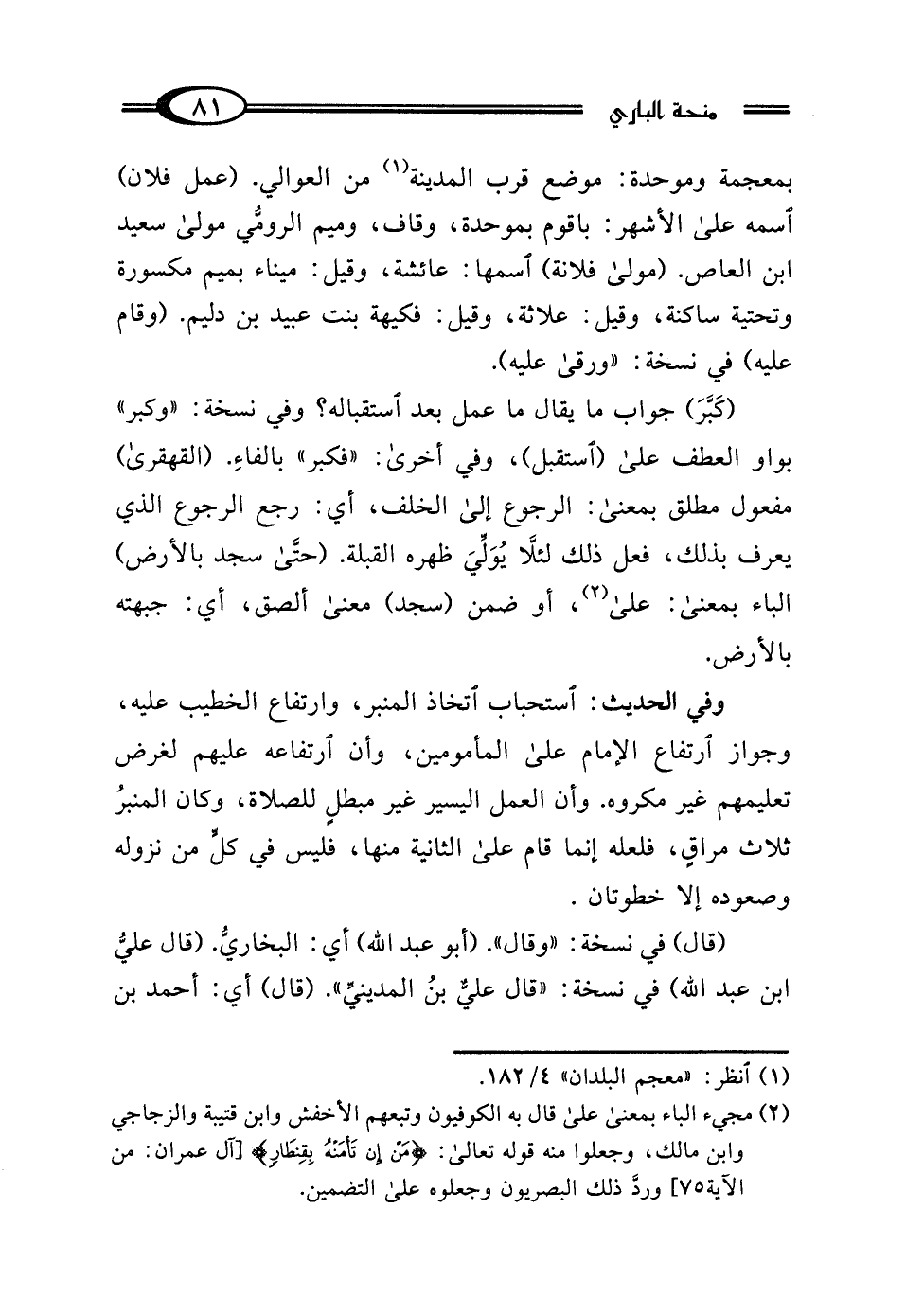 (كَبَّرَ) جواب ما يقال ما عمل بعد استقباله؟ وفي نسخة: "وكبر" بواو العطف على (استقبل)، وفي أخرى: "فكبر" بالفاءِ. (القهقرى) مفعول مطلق بمعنى: الرجوع إلى الخلف، أي: رجع الرجوع الذي يعرف بذلك، فعل ذلك لئلَّا يُوَلِّيَ ظهره القبلة. (حتَّى سجد بالأرض) الباء بمعنى: على (¬2)، أو ضمن (سجد) معنى ألصق، أي: جبهته بالأرض.