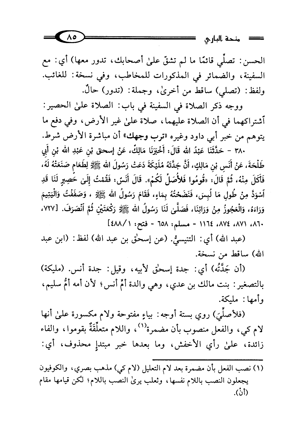 380 - حَدَّثَنَا عَبْدُ اللَّهِ بْنُ يُوسُفَ، قَالَ: أَخْبَرَنَا مَالِكٌ، عَنْ إِسْحَاقَ بْنِ عَبْدِ اللَّهِ بْنِ أَبِي طَلْحَةَ، عَنْ أَنَسِ بْنِ مَالِكٍ، أَنَّ جَدَّتَهُ مُلَيْكَةَ دَعَتْ رَسُولَ اللَّهِ صَلَّى اللهُ عَلَيْهِ وَسَلَّمَ لِطَعَامٍ صَنَعَتْهُ لَهُ، فَأَكَلَ مِنْهُ، ثُمَّ قَالَ: "قُومُوا فَلِأُصَلِّ لَكُمْ" قَالَ أَنَسٌ: فَقُمْتُ إِلَى حَصِيرٍ لَنَا، قَدِ اسْوَدَّ مِنْ طُولِ مَا لُبِسَ، فَنَضَحْتُهُ بِمَاءٍ، فَقَامَ رَسُولُ اللَّهِ صَلَّى اللهُ عَلَيْهِ وَسَلَّمَ، وَصَفَفْتُ وَاليَتِيمَ وَرَاءَهُ، وَالعَجُوزُ مِنْ وَرَائِنَا، فَصَلَّى لَنَا رَسُولُ اللَّهِ صَلَّى اللهُ عَلَيْهِ وَسَلَّمَ رَكْعَتَيْنِ، ثُمَّ انْصَرَفَ.