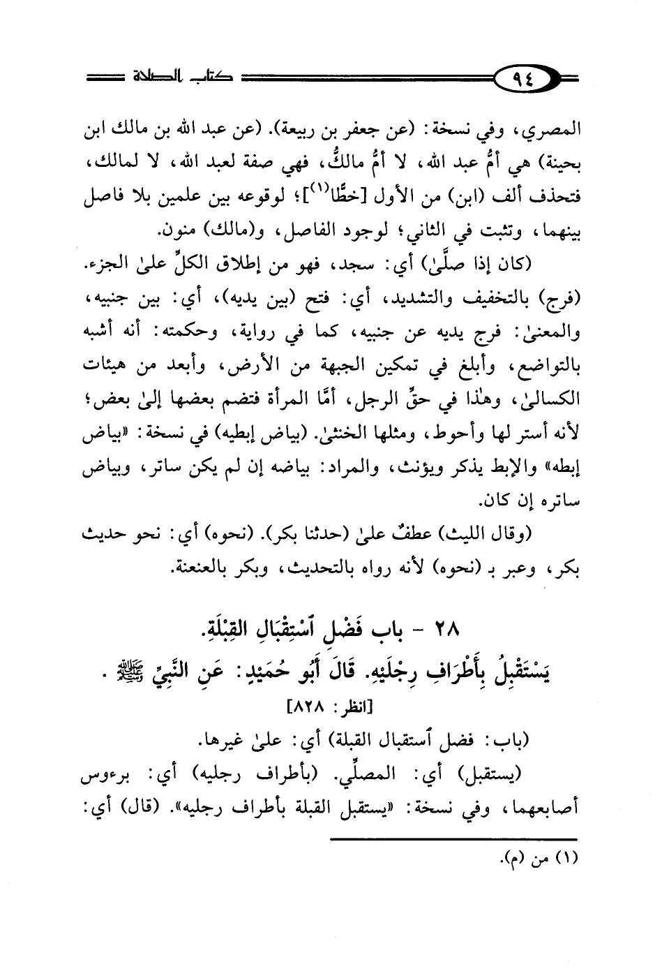 المصري، وفي نسخة: (عن جعفر بن ربيعة). (عن عبد الله بن مالك بن بحينة) هي أمُّ عبد الله، لا أمُّ مالكُّ، فهي صفة لعبد الله، لا لمالك، فتحذف ألف (ابن) من الأول [خطًّا (¬1)]؛ لوقوعه بين علمين بلا فاصل بينهما، وتثبت في الثاني؛ لوجود الفاصل، و (مالك) منون.
