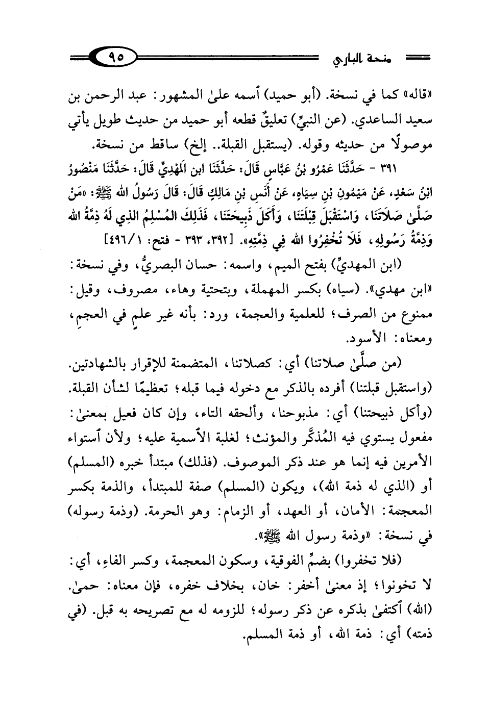 391 - حَدَّثَنَا عَمْرُو بْنُ عَبَّاسٍ، قَالَ: حَدَّثَنَا ابْنُ المَهْدِيِّ، قَالَ: حَدَّثَنَا مَنْصُورُ بْنُ سَعْدٍ، عَنْ مَيْمُونِ بْنِ سِيَاهٍ، عَنْ أَنَسِ بْنِ مَالِكٍ، قَالَ: قَالَ رَسُولُ اللَّهِ صَلَّى اللهُ عَلَيْهِ وَسَلَّمَ: "مَنْ صَلَّى صَلاتَنَا وَاسْتَقْبَلَ قِبْلَتَنَا، وَأَكَلَ ذَبِيحَتَنَا فَذَلِكَ المُسْلِمُ الَّذِي لَهُ ذِمَّةُ اللَّهِ وَذِمَّةُ رَسُولِهِ، فَلَا تُخْفِرُوا اللَّهَ فِي ذِمَّتِهِ".