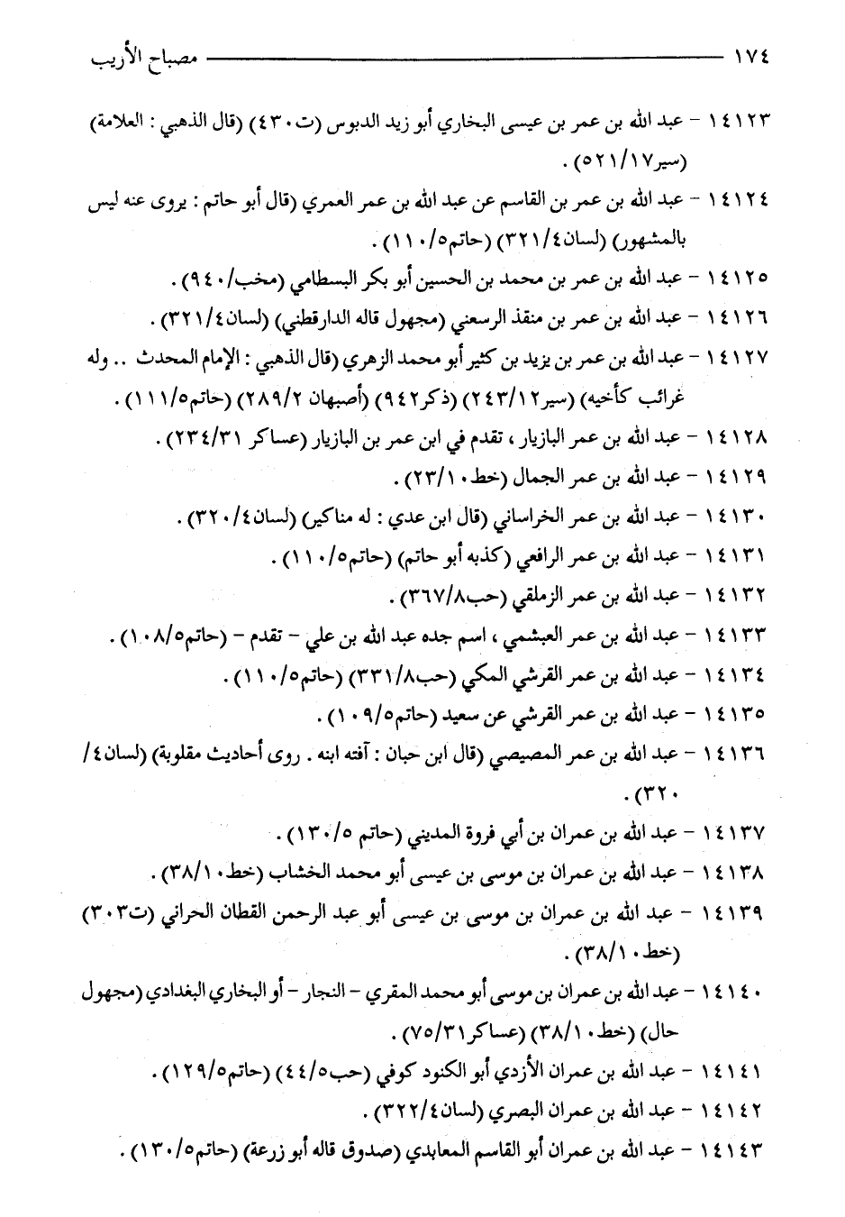 14140 - عبد الله بن عمران بن موسى أبو محمّد المقري -النجار- أو البخاريّ البغدادي (مجهول حال) (خط 10/ 38) (عساكر 31/ 75).