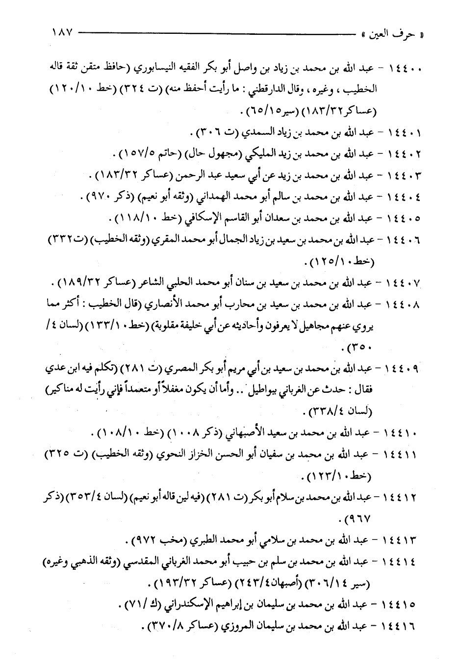 14406 - عبد الله بن محمّد بن سعيد بن زياد الجمال أبو محمّد المقري (وثقه الخطيب) (ت 332) (خط 10/ 125).