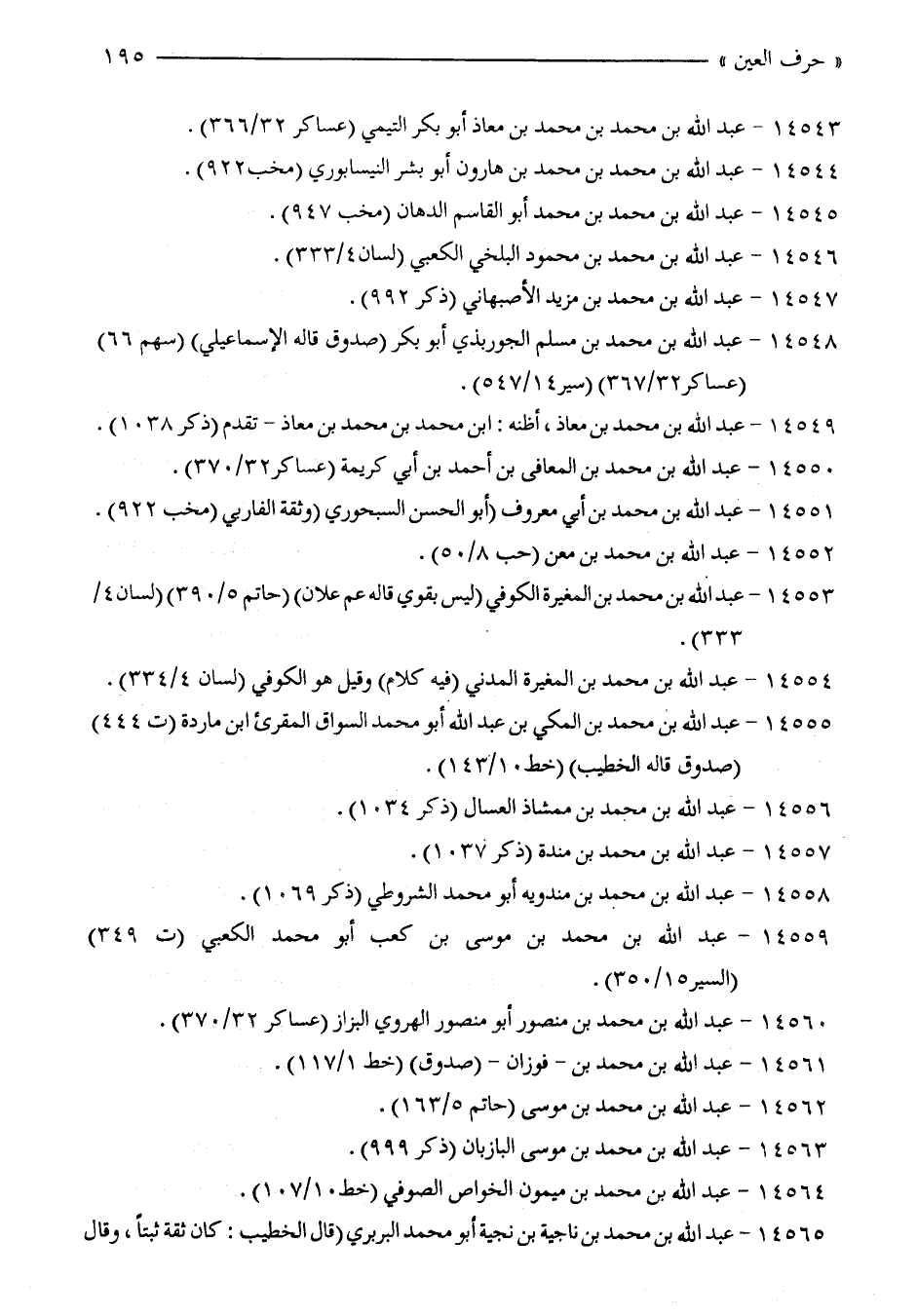 14553 - عبد الله بن محمّد بن المغيرة الكوفي (ليس بقوي قاله عم علان) (حاتم 5/ 390) (لسان 4/ 333).