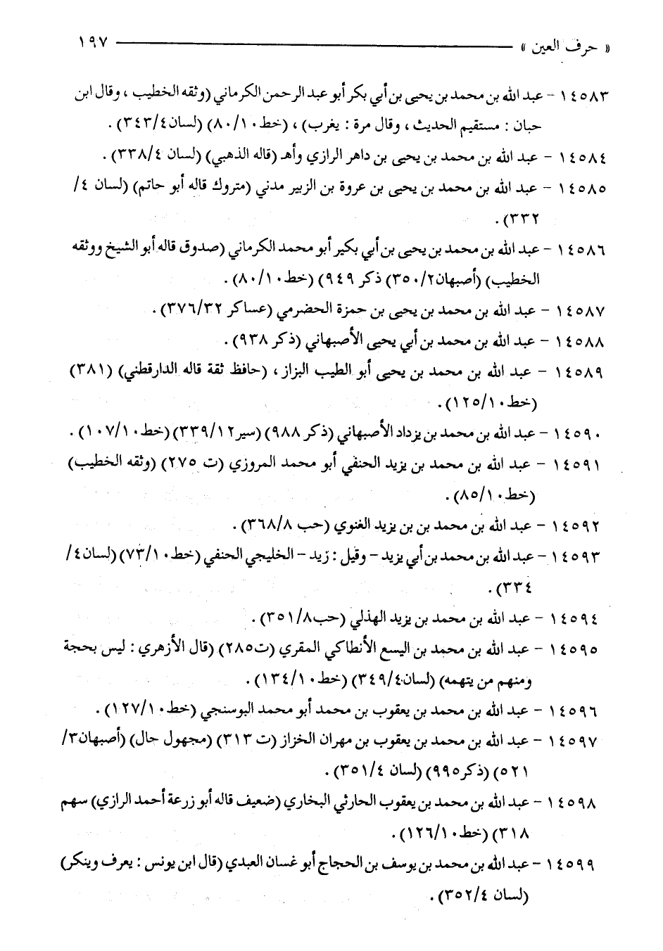 14586 - عبد الله بن محمّد بن يحيى بن أبي بكير أبو محمّد الكرماني (صدوق قاله، أبو الشّيخ ووثقه الخطيب) (أصبهان 2/ 350) (ذ كر 949) (خط 10/ 80).
