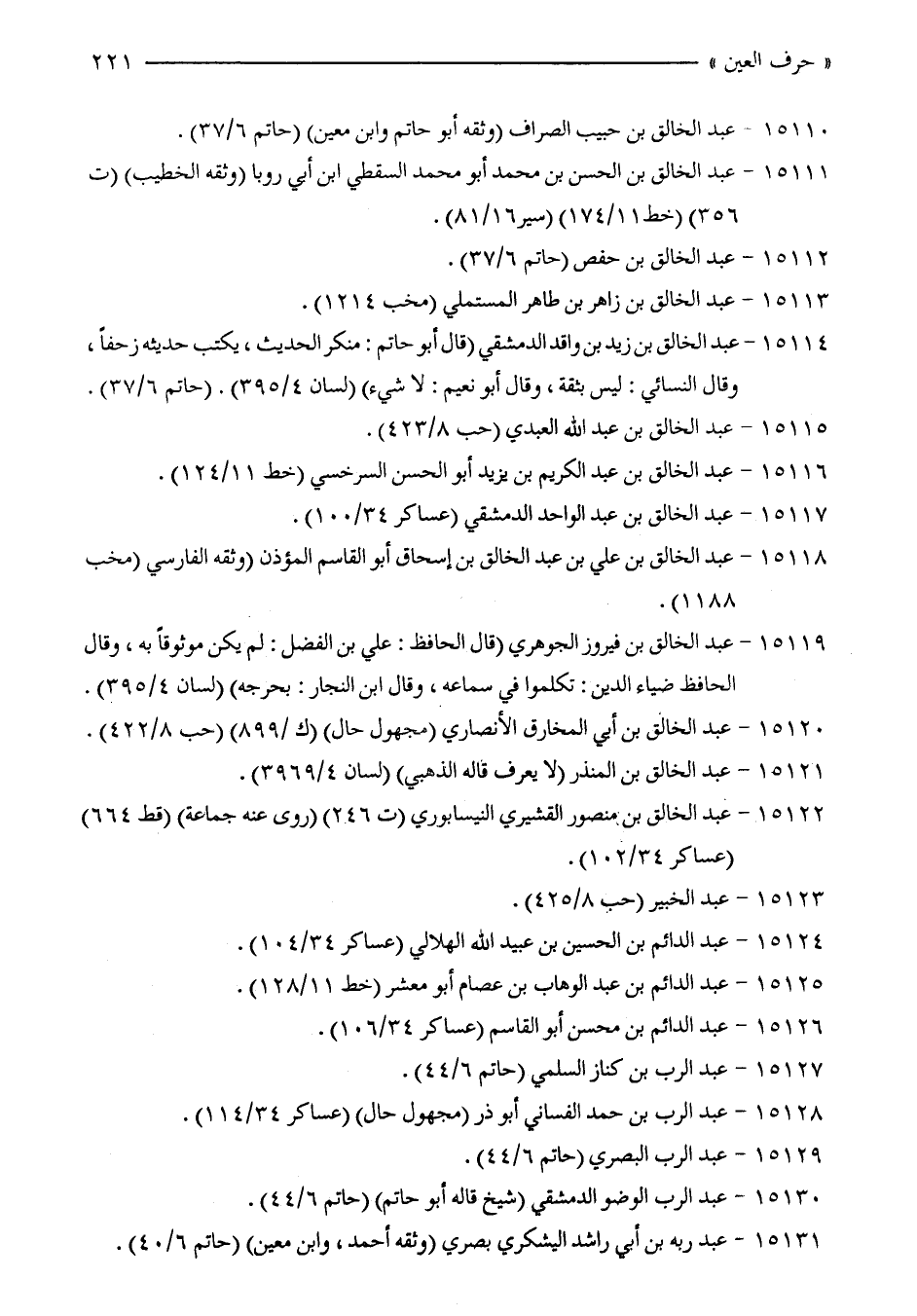 15119 - عبد الخالق بن فيروز الجوهري (قال الحافظ: علي بن الفضل: لم يكن موثوقًا به، وقال الحافظ ضياء الدين: تكلموا في سماعه، وقال ابن النجار: بحرجه) (لسان 4/ 395).
