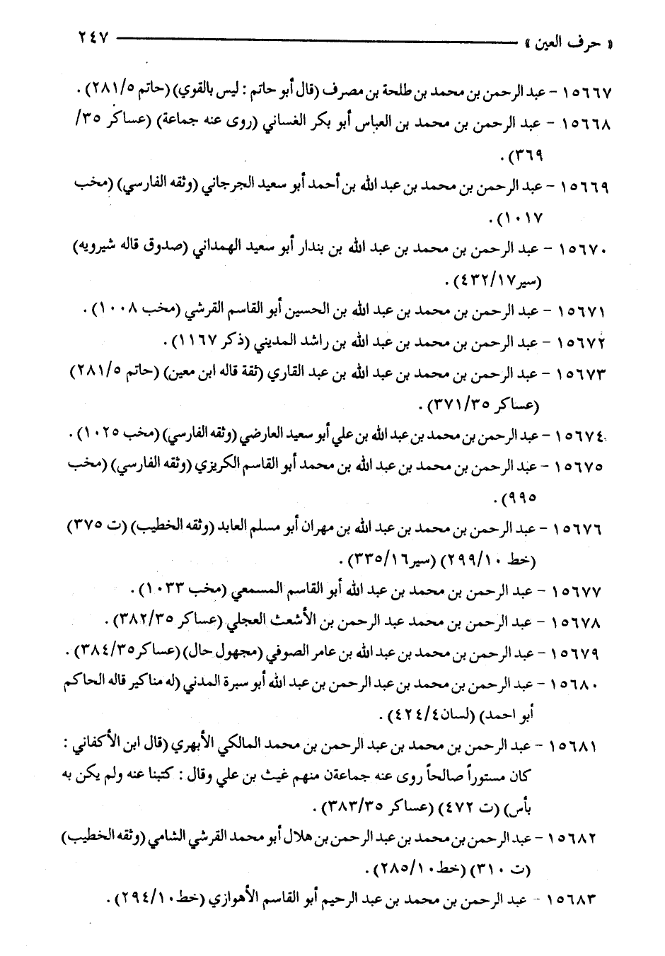 15668 - عبد الرّحمن بن محمّد بن العباس أبو بكر الغساني (روى عنه جماعة) (عساكر 35/ 369).