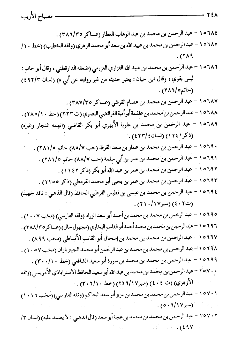 15694 - عبد الرّحمن بن محمّد بن عيسى بن فطيس القرطبي الحافظ (قال الذهبي: ناقد جهبذ) (ت 402) (سير 17/ 210).