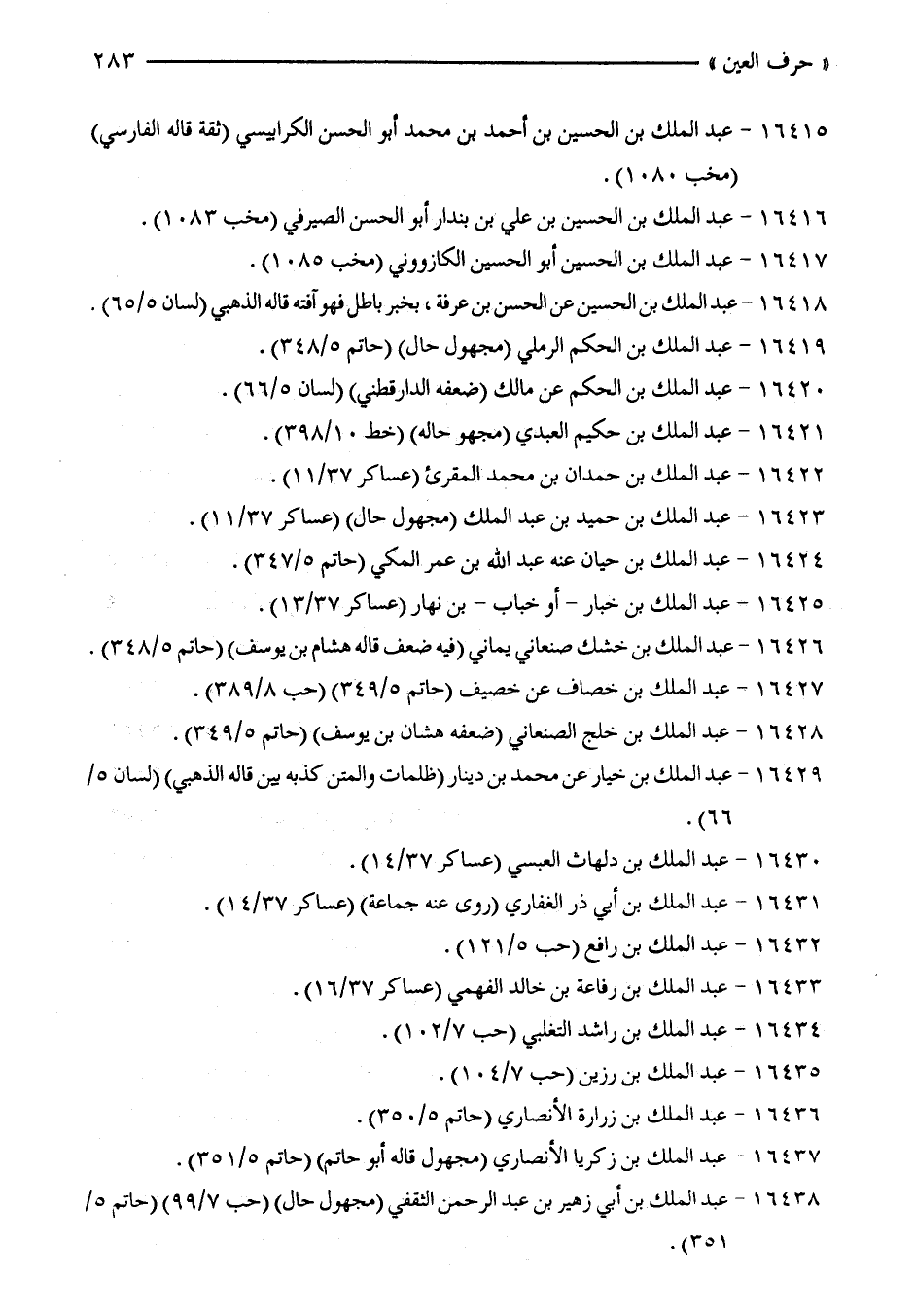 16428 - عبد الملك بن خلج الصنعاني (ضعفه هشان بن يوسف) (حاتم 5/ 349).