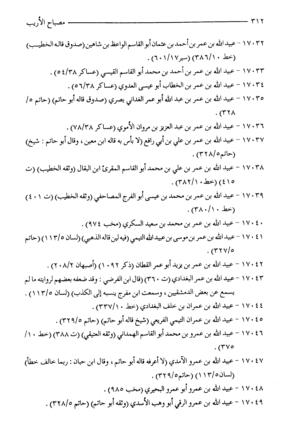 17043 - عبيد الله بن عمر البغدادي (ت 360) (قال ابن الفرضي: وقد ضعفه بعضهم لروايته ما لم يسمع عن بعض الدمشقيين، وسمعت ابن مفرج ينسبه إلى الكذب) (لسان 5/ 113).