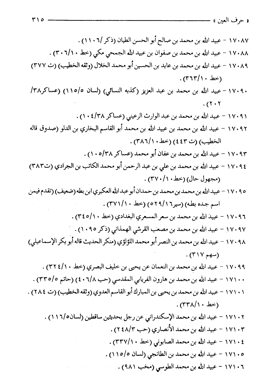 17098 - عبيد الله بن محمد بن النصر أبو محمد اللؤلؤي (منكر الحديث قاله أبو بكر الإسماعيلي) (سهم 317).