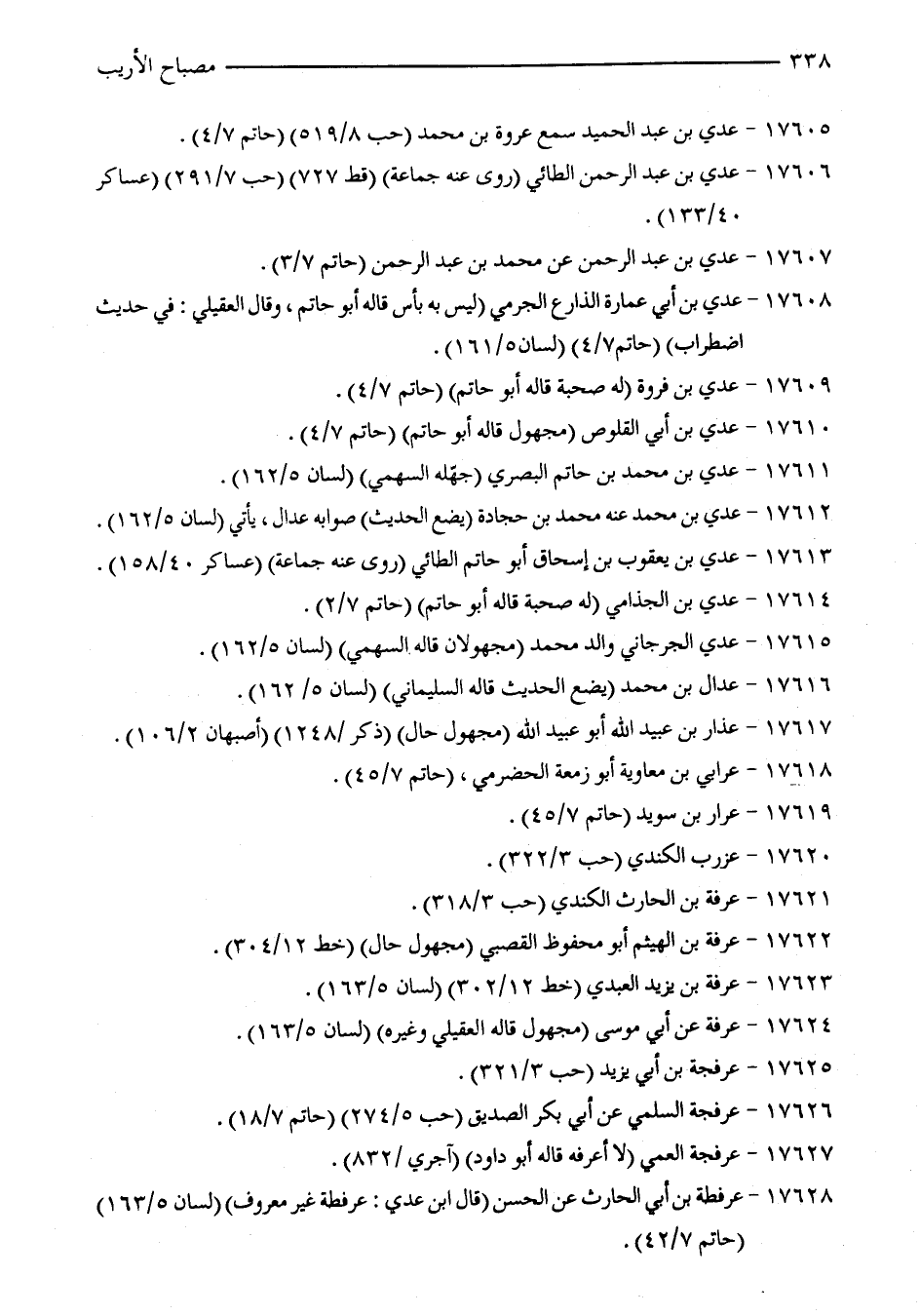17628 - عرفطة بن أبي الحارث عن الحسن (قال ابن عدي: عرفطة غير معروف) (لسان 5/ 163) (حاتم 7/ 42).