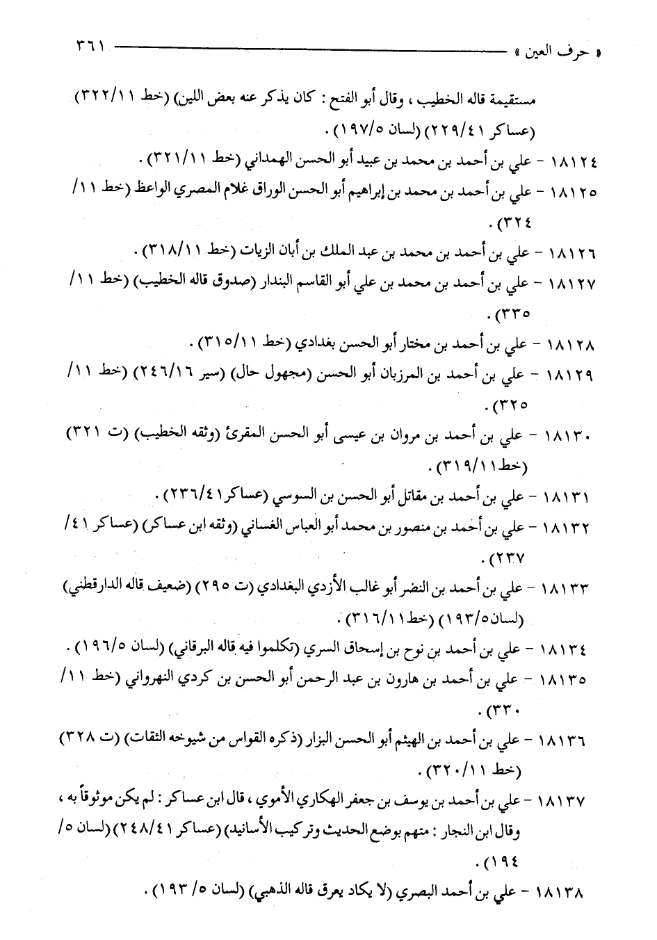 18130 - علي بن أحمد بن مروان بن عيسى أبو الحسن المقرئ (وثقه الخطيب) (ت 321) (خط 11/ 319).