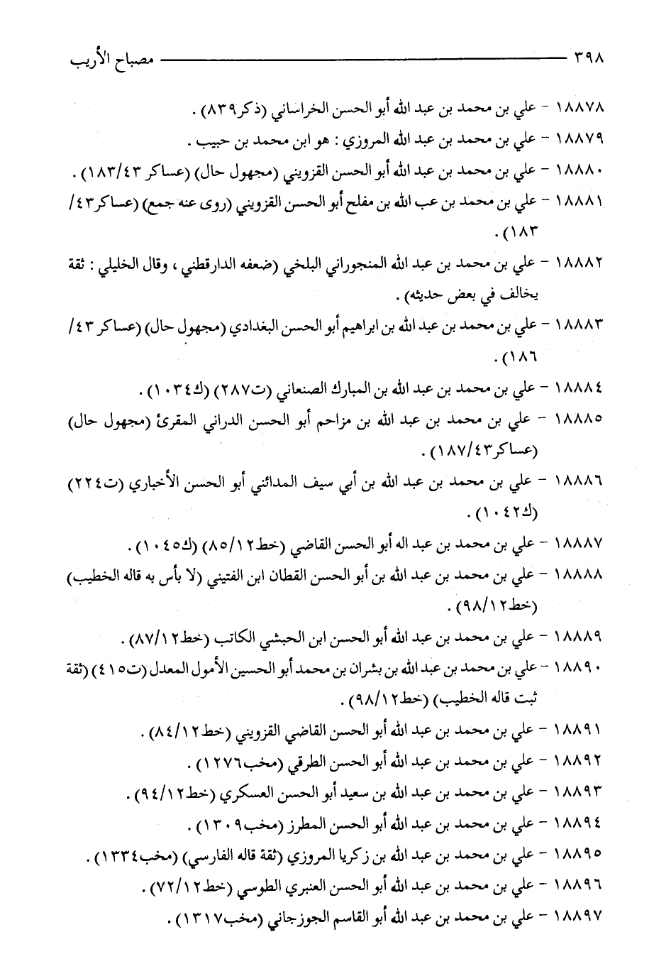 18888 - علي بن محمد بن عبد الله بن أبو الحسن القطان ابن الفتيني (لا بأس به قاله الخطيب) (خط 12/ 98).