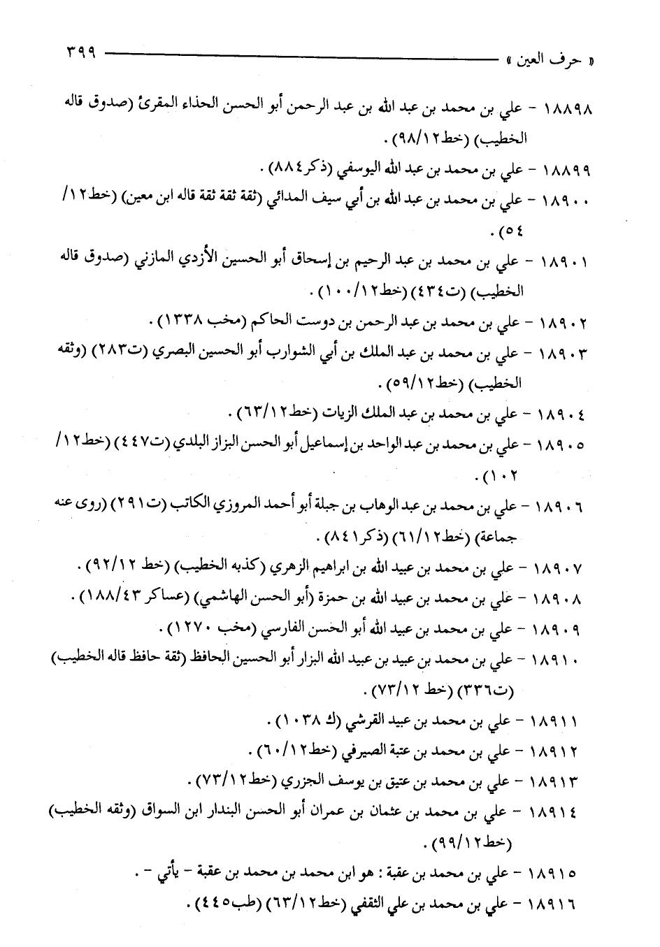 18910 - علي بن محمد بن عبيد بن عبيد الله البزار أبو الحسين الحافظ (ثقة حافظ قاله الخطيب) (ت 336) (خط 12/ 73).