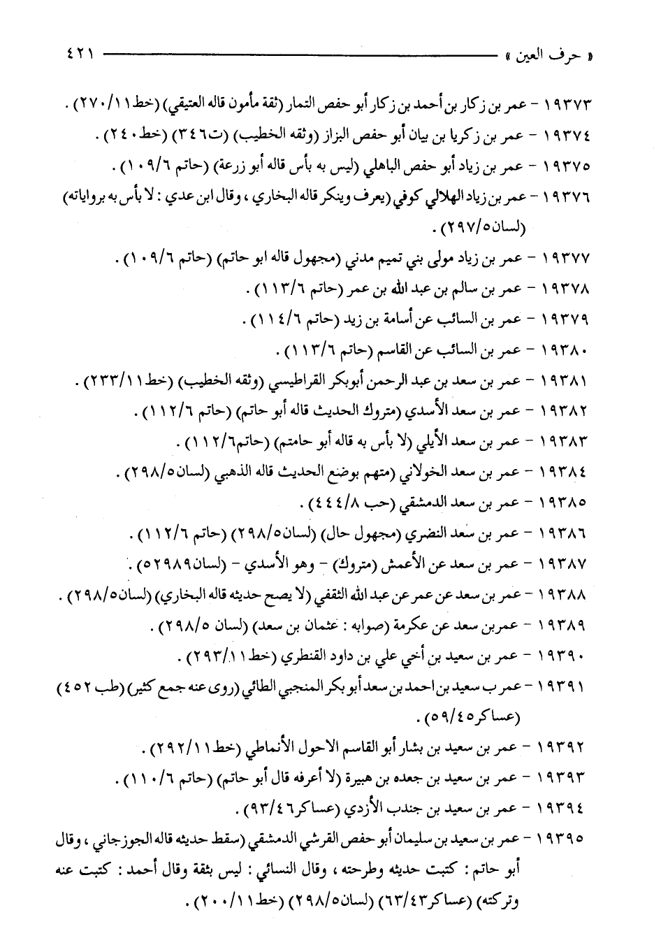 19373 - عمر بن زكار بن أحمد بن زكار أبو حفص التمار (ثقة مأمون قاله العتيقي) (خط 11/ 270).