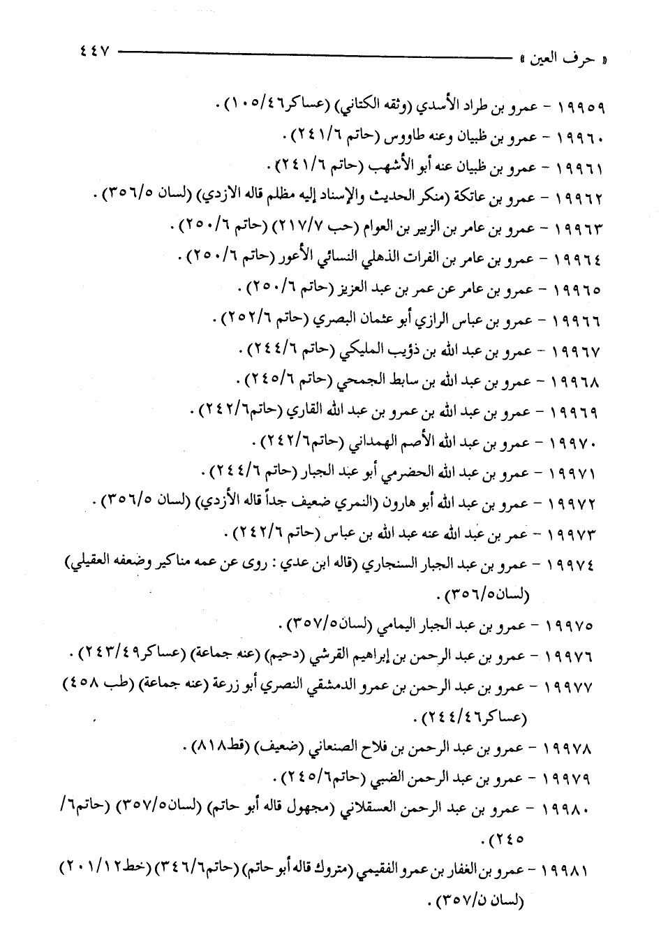 19980 - عمرو بن عبد الرحمن العسقلاني (مجهول قاله أبو حاتم) (لسان 5/ 357) (حاتم 6/ 245).