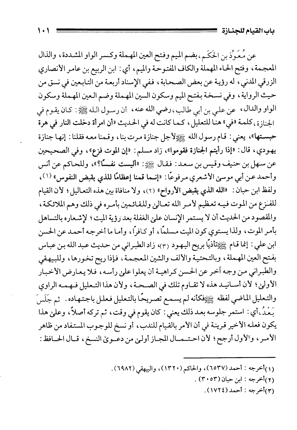 عن مُعَوِّذ بن الحَكَم، بضم الميم وفتح العين المهملة وكسر الواو المشددة، والذال المعجمة، وفتح الحاء المهملة والكاف المفتوحة والميم، أي: ابن الربيع بن عامر الأنصاري الزرقي المدني، له رؤية عن بعض الصحابة، ففي الإِسناد أربعة من التابعين في نسق من حيث الرواية، وفي نسخة بفتح الميم وسكون السين المهملة وضم العين المهملة وسكون الواو والدال، عن علي بن أبي طالب، رضي الله عنه، أن رسول الله - صلى الله عليه وسلم -: كان يقوم في الجنازة، كلمة "في" هنا للتعليل، كما كانت له في الحديث "أن امرأة دخلت النار في هرة حبستها"، يعني: قام رسول الله - صلى الله عليه وسلم - لأجل جنازة مرت بنا، وقمنا معه فقلنا: إنها جنازة يهودي، قال: "إذا رأيتم الجنازة فقوموا"، زاد مسلم: "إن الموت فزع"، وفي الصحيحين عن سهل بن حنيف وقيس بن سعد: فقال - صلى الله عليه وسلم -: "أليست نفسًا؟ "، وللحاكم عن أنس وأحمد عن أبي موسى الأشعري مرفوعًا: "إنما قمنا إعظامًا للذي يقبض النفوس" (¬1)، ولفظ ابن حبان: "الله الذي يقبض الأرواح" (¬2)، ولا منافاة بين هذه التعاليل؛ لأن القيام للفزع من الموت فيه تعظيم لأمر الله تعالى وللقائمين بأمره في ذلك وهم الملائكة، والمقصود من الحديث أن لا يستمر الإِنسان على الغفلة بعد رؤية الميت؛ لإِشعاره بالتساهل بأمر الموت، ولذا يستوي كون الميت مسلمًا، أو كافرًا، وأما ما أخرجه أحمد عن الحسن بن علي: إنما قام - صلى الله عليه وسلم - تأذيًا بريح اليهود (¬3)، زاد الطبراني من حديث عبد الله بن عباس بفتح العين المهملة، وبالتحتية والألف والشين المعجمة، فإذا ريح تخورها، وللبيهقي والطبراني من وجه آخر عن الحسن كراهية أن يعلوا على رأسه، فلا يعارض الأخبار الأولى؛ لأن أسانيد هذه لا تقاوم تلك في الصحة، ولأن هذا التعليل فهمه الراوي والتعليل الماضي لفظه - صلى الله عليه وسلم - فكأنه لم يسمع تصريحًا بالتعليل فعلل باجتهاده. ثم جَلَسَ بَعْدُ، أي: استمر جلوسه بعد ذلك يعني: كان يقوم في وقت، ثم تركه أصلًا، وعلى هذا يكون فعله الأخير قرينة في أن الأمر بالقيام للندب، أو نسخ للوجوب المستفاد من ظاهر الأمر، والأول أرجح؛ لأن احتمال المجاز أولى من دعوى النسخ، قال الحافظ: