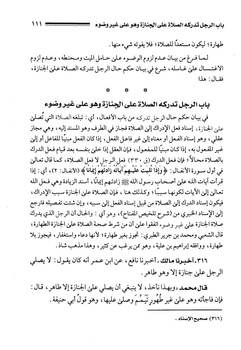 316 - أخبرنا مالك، أخبرنا نافع، عن ابن عمر أنه كان يقول: لا يصلي الرجل على جنازة إلا وهو طاهر.
