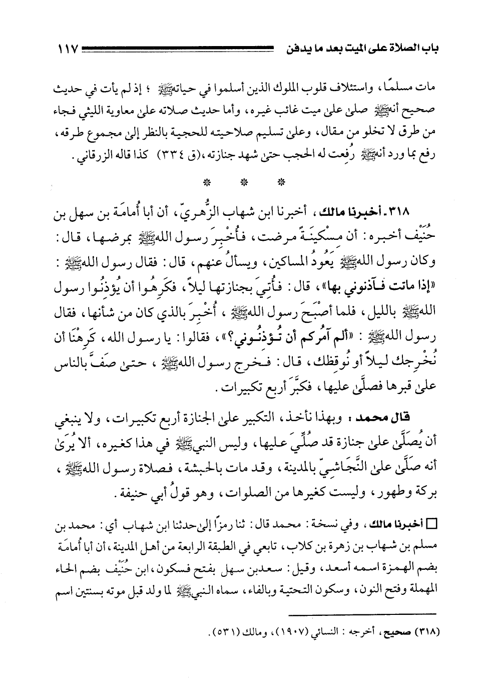 318 - أخبرنا مالك، أخبرنا ابن شهاب الزُّهريّ، أن أبا أُمامَة بن سهل بن حُنَيْف أخبره: أن مِسْكينَةً مرضت، فأُخْبِرَ رسول الله - صلى الله عليه وسلم - بمرضها، قال: وكان رسول الله - صلى الله عليه وسلم - يَعُودُ المساكين، ويسألُ عنهم، قال: فقال رسول الله - صلى الله عليه وسلم -: "إذا ماتت فآذنوني بها"، قال: فأُتِيَ بجنازتها ليلًا، فكَرِهُوا أن يُؤذِنُوا رسول الله - صلى الله عليه وسلم - بالليل، فلما أصْبَحَ رسول الله - صلى الله عليه وسلم - أُخْبِرَ بالذي كان من شأنها، فقال رسول الله - صلى الله عليه وسلم -: "ألم آمُركم أن تُؤذِنُوني؟ "، فقالوا: يا رسول الله، كَرِهْنَا أن نُخْرِجك ليلًا أو نُوقِظك، قال: فخرج رسول الله - صلى الله عليه وسلم -، حتى صَفَّ بالناس على قبرها فصلَّى عليها، فكبَّرَ أربع تكبيرات.