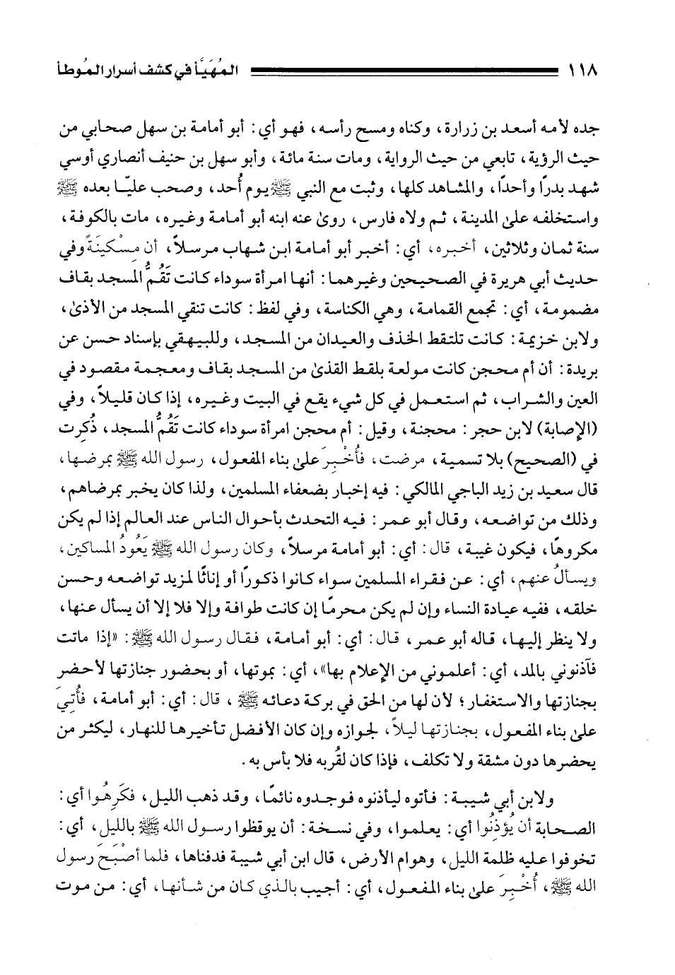 جده لأمه أسعد بن زرارة، وكناه ومسح رأسه، فهو أي: أبو أمامة بن سهل صحابي من حيث الرؤية، تابعي من حيث الرواية، ومات سنة مائة، وأبو سهل بن حنيف أنصاري أوسي شهد بدرًا وأحدًا، والمشاهد كلها، وثبت مع النبي - صلى الله عليه وسلم - يوم أُحد، وصحب عليّا بعده - صلى الله عليه وسلم - واستخلفه على المدينة، ثم ولاه فارس، روى عنه ابنه أبو أمامة وغيره، مات بالكوفة، سنة ثمان وثلاثين، أخبره، أي: أخبر أبو أمامة ابن شهاب مرسلًا، أن مِسْكينَةً وفي حديث أبي هريرة في الصحيحين وغيرهما: أنها امرأة سوداء كانت تَقُمُّ المسجد بقاف مضمومة، أي: تجمع القمامة، وهي الكناسة، وفي لفظ: كانت تنقي المسجد من الأذى، ولابن خزيمة: كانت تلتقط الخذف والعيدان من المسجد، وللبيهقي بإسناد حسن عن بريدة: أن أم محجن كانت مولعة بلقط القذى من المسجد بقاف ومعجمة مقصود في العين والشراب، ثم استعمل في كل شيء يقع في البيت وغيره، إذا كان قليلًا، وفي (الإِصابة) لابن حجر: محجنة، وقيل: أم محجن امرأة سوداء كانت تَقُمُّ المسجد، ذُكِرت في (الصحيح) بلا تسمية، مرضت، فأُخْبِرَ على بناء المفعول، رسول الله - صلى الله عليه وسلم - بمرضها، قال سعيد بن زيد الباجي المالكي: فيه إخبار بضعفاء المسلمين، ولذا كان يخبر بمرضاهم، وذلك من تواضعه، وقال أبو عمر: فيه التحدث بأحوال الناس عند العالم إذا لم يكن مكروهًا، فيكون غيبة، قال: أي: أبو أمامة مرسلًا، وكان رسول الله - صلى الله عليه وسلم - يَعُودُ المساكين، ويسألُ عنهم، أي: عن فقراء المسلمين سواء كانوا ذكورًا أو إناثًا لمزيد تواضعه وحسن خلقه، ففيه عيادة النساء وإن لم يكن محرمًا إن كانت طوافة وإلا فلا إلا أن يسأل عنها، ولا ينظر إليها، قاله أبو عمر، قال: أي: أبو أمامة، فقال رسول الله - صلى الله عليه وسلم -: "إذا ماتت فآذنوني بالمد، أي: أعلموني من الإِعلام بها"، أي: بموتها، أو بحضور جنازتها لأحضر بجنازتها والاستغفار؛ لأن لها من الحق في بركة دعائه - صلى الله عليه وسلم -، قال: أي: أبو أمامة، فأُتِيَ على بناء المفعول، بجنازتها ليلًا، لجوازه وإن كان الأفضل تأخيرها للنهار، ليكثر من يحضرها دون مشقة ولا تكلف، فإذا كان لقُربه فلا بأس به.