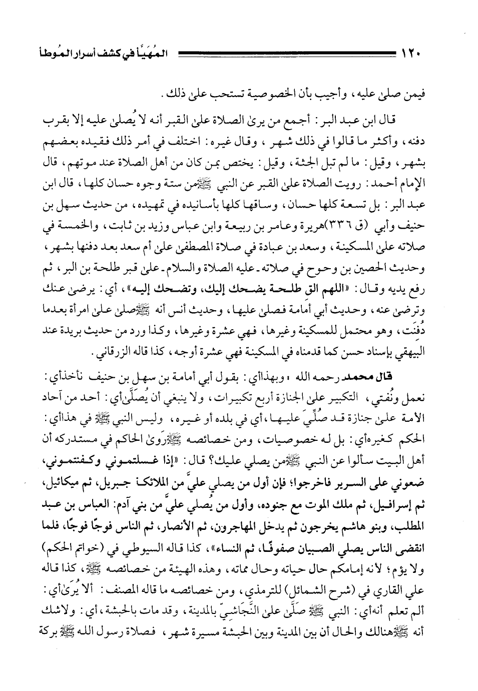 قال محمد - رحمه الله: وبهذا أي: بقول أبي أمامة بن سهل بن حنيف نأخذ أي: نعمل ونُفتي، التكبير على الجنازة أربع تكبيرات، ولا ينبغي أن يُصَلَّى أي: أحد من آحاد الأمة على جنازة قد صُلِّيَ عليها، أي في بلده أو غيره، وليس النبي - صلى الله عليه وسلم - في هذا أي: الحكم كغيره أي: بل له خصوصيات، ومن خصائصه - صلى الله عليه وسلم - روى الحاكم في مستدركه أن أهل البيت سألوا عن النبي - صلى الله عليه وسلم - من يصلي عليك؟ قال: "إذا غسلتموني وكفنتموني، ضعوني على السرير فاخرجوا؛ فإن أول من يصلي عليَّ من الملائكة جبريل، ثم ميكائيل، ثم إسرافيل، ثم ملك الموت مع جنوده، وأول من يُصلي عليَّ من بني آدم: العباس بن عبد المطلب، وبنو هاشم يخرجون ثم يدخل المهاجرون، ثم الأنصار، ثم الناس فوجًا فوجًا، فلما انقضى الناس يصلي الصبيان صفوفًا، ثم النساء"، كذا قاله السيوطي في (خواتم الحكم) ولا يؤم؛ لأنه إمامكم حال حياته وحال مماته، وهذه الهيئة من خصائصه - صلى الله عليه وسلم -، كذا قاله علي القاري في (شرح الشمائل) للترمذي، ومن خصائصه ما قاله المصنف: ألا يُرَى أي: ألم تعلم أنه أي: النبي - صلى الله عليه وسلم - صَلَّى على النَّجَاشِيّ بالمدينة، وقد مات بالحبشة، أي: ولا شك أنه - صلى الله عليه وسلم - هنالك والحال أن بين المدينة وبين الحبشة مسيرة شهر، فصلاة رسول الله - صلى الله عليه وسلم - بركة