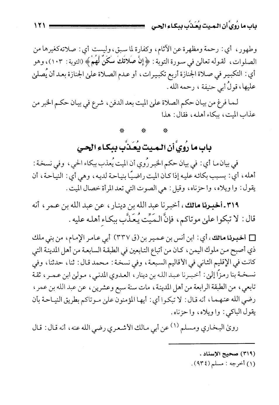 319 - أخبرنا مالك، أخبرنا عبد الله بن دينار، عن عبد الله بن عمر، أنه قال: لا تبكوا على موتاكم، فإنَّ المَيِّت يُعَذَّب ببكاءِ أهله عليه.