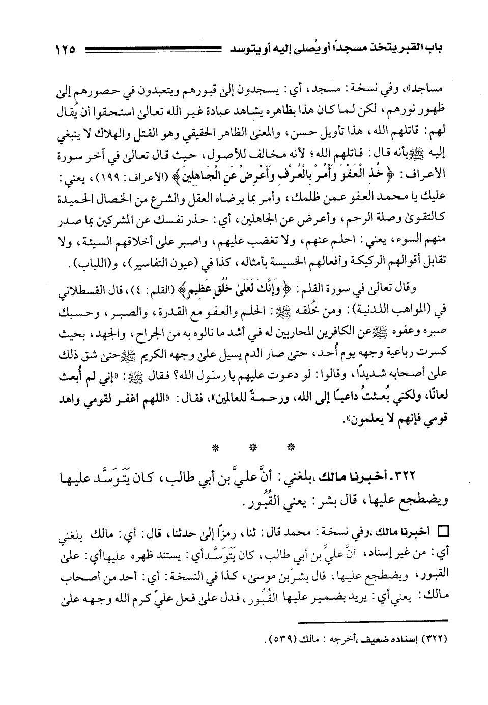 • أخبرنا مالك، وفي نسخة: محمد قال: ثنا، رمزًا إلى حدثنا، قال: أي: مالك بلغني أي: من غير إسناد، أنَّ علي بن أبي طالب، كان يَتَوَسَّد أي: يستند ظهره عليها أي: على القبور، ويضطجع عليها، قال بشر بن موسى، كذا في النسخة: أي: أحد من أصحاب مالك: يعني أي: يريد بضمير عليها القُبُور، فدل على فعل عليّ كرم الله وجهه على