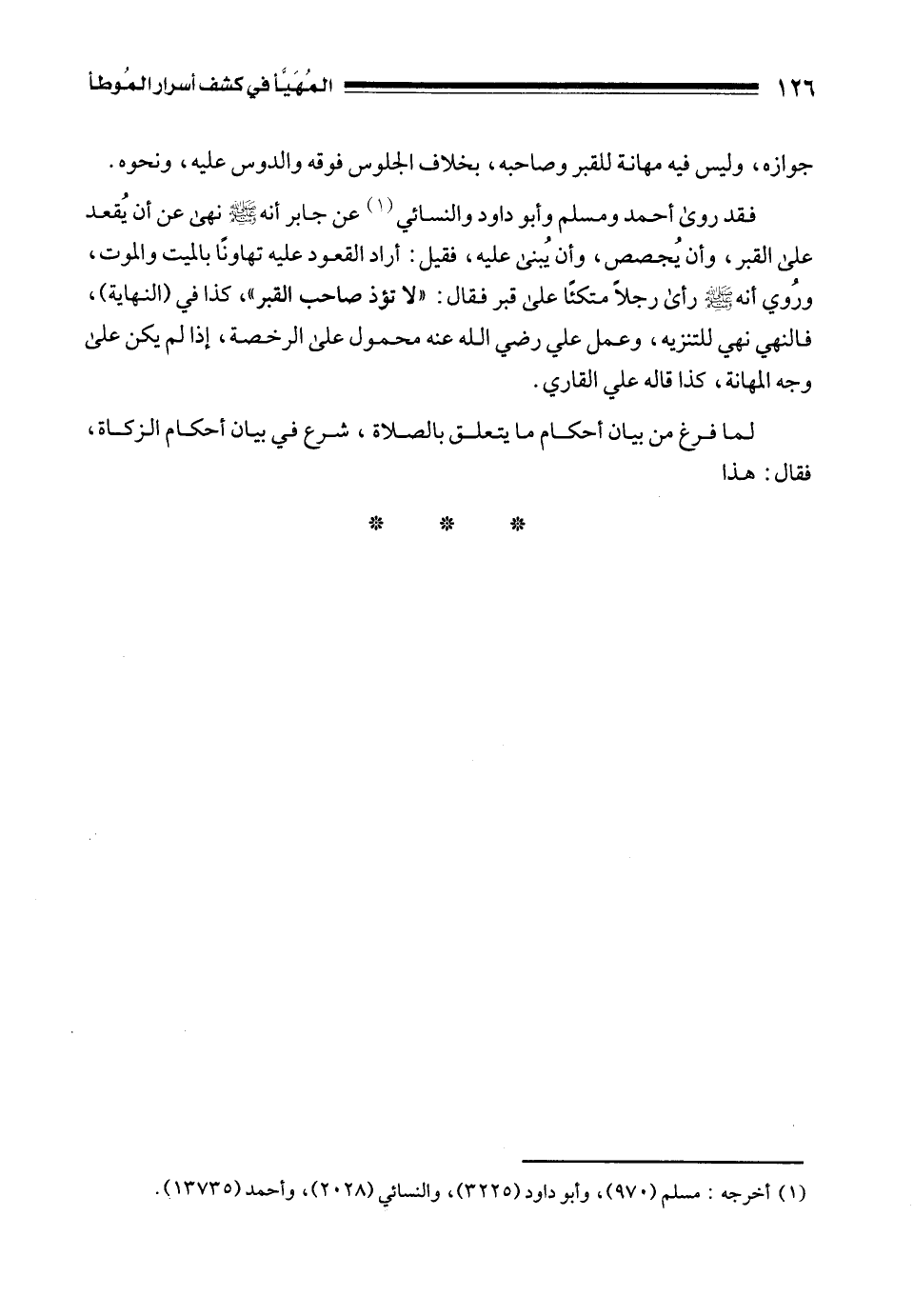 فقد روى أحمد ومسلم وأبو داود والنسائي (¬1) عن جابر أنه - صلى الله عليه وسلم - نهى عن أن يُقعد على القبر، وأن يُجصص، وأن يُبنى عليه، فقيل: أراد القعود عليه تهاونًا بالميت والموت، ورُوي أنه - صلى الله عليه وسلم - رأى رجلًا متكئًا على قبر فقال: "لا تؤذ صاحب القبر"، كذا في (النهاية)، فالنهي نهي للتنزيه، وعمل علي رضي الله عنه محمول على الرخصة، إذا لم يكن على وجه المهانة، كذا قاله علي القاري.