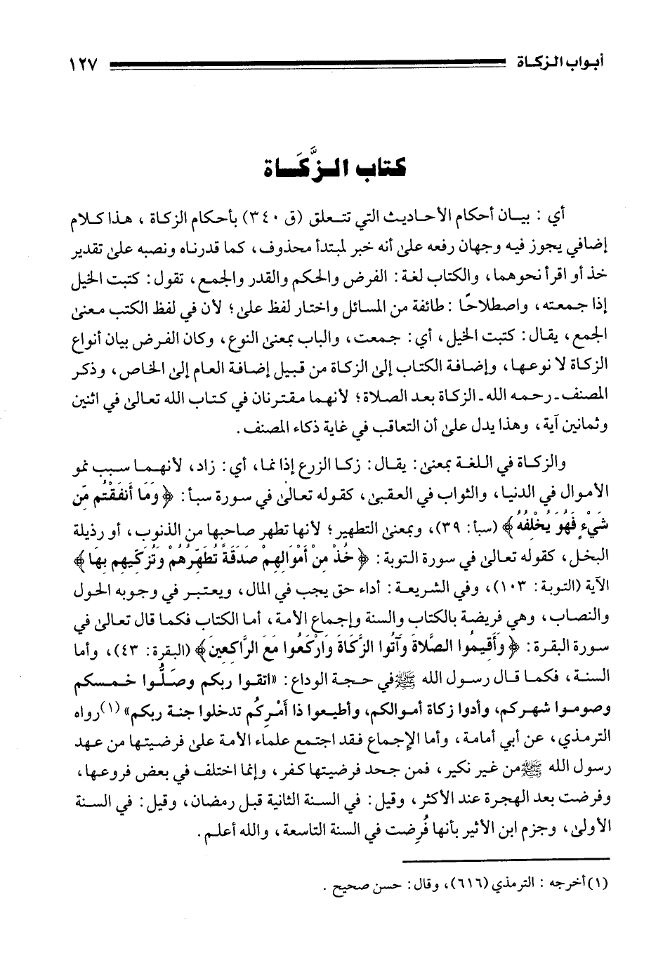 أي: بيان أحكام الأحاديث التي تتعلق (ق 340) بأحكام الزكاة، هذا كلام إضافي يجوز فيه وجهان رفعه على أنه خبر لمبتدأ محذوف، كما قدرناه ونصبه على تقدير خذ أو اقرأ نحوهما، والكتاب لغة: الفرض والحكم والقدر والجمع، تقول: كتبت الخيل إذا جمعته، واصطلاحًا: طائفة من المسائل واختار لفظ على؛ لأن في لفظ الكتب معنى الجمع، يقال: كتبت الخيل، أي: جمعت، والباب بمعنى النوع، وكان الفرض بيان أنواع الزكاة لا نوعها، وإضافة الكتاب إلى الزكاة من قبيل إضافة العام إلى الخاص، وذكر المصنف - رحمه الله - الزكاة بعد الصلاة؛ لأنهما مقترنان في كتاب الله تعالى في اثنين وثمانين آية، وهذا يدل على أن التعاقب في غاية ذكاء المصنف.