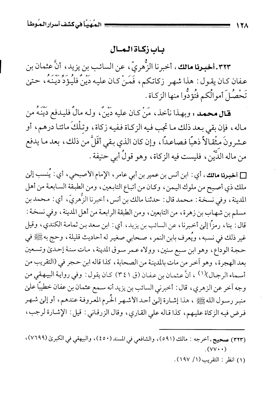 323 - أخبرنا مالك، أخبرنا الزُّهريّ، عن السائب بن يزيد، أنَّ عثمان بن عفان كان يقول: هذا شهر زكاتكم، فَمَنْ كان عليه دَيْنٌ فليُؤَدِّ دَيْنَهُ، حتى تَحْصُلَ أموالُكم فتُؤدُّوا منها الزكاة.