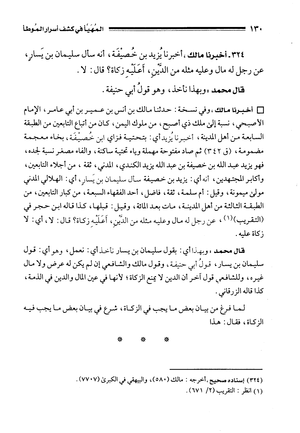 324 - أخبرنا مالك، أخبرنا يزيد بن خُصيْفَة، أنه سأل سليمان بن يَسارٍ، عن رجل له مال وعليه مثله من الدَّيْنِ، أَعَلَيْهِ زكاة؟ قال: لا.