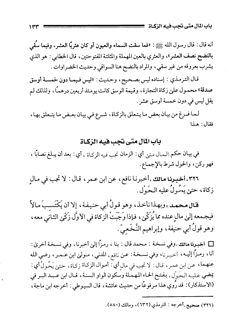 • أخبرنا مالك، وفي نسخة: محمد قال: بنا، رمزًا إلى أخبرنا، وفي نسخة أخرى: أنا، رمزًا إليه، أخبرنا، وفي نسخة: عن نافع، المدني، مولى ابن عمر، رضي الله عنهما، عن ابن عمر، قال: لا تجب في مالٍ أي: أموال الزكاة زكاة، حتى يَحُولُ أي: يمضي عليه الحَوْل، بفتح الحاء المهملة وسكون الواو السنة، قال ابن عبد البر في (الاستذكار): قد رُوي هذا مرفوعًا من حديث عائشة، قال السيوطي: أخرجه ابن ماجه،