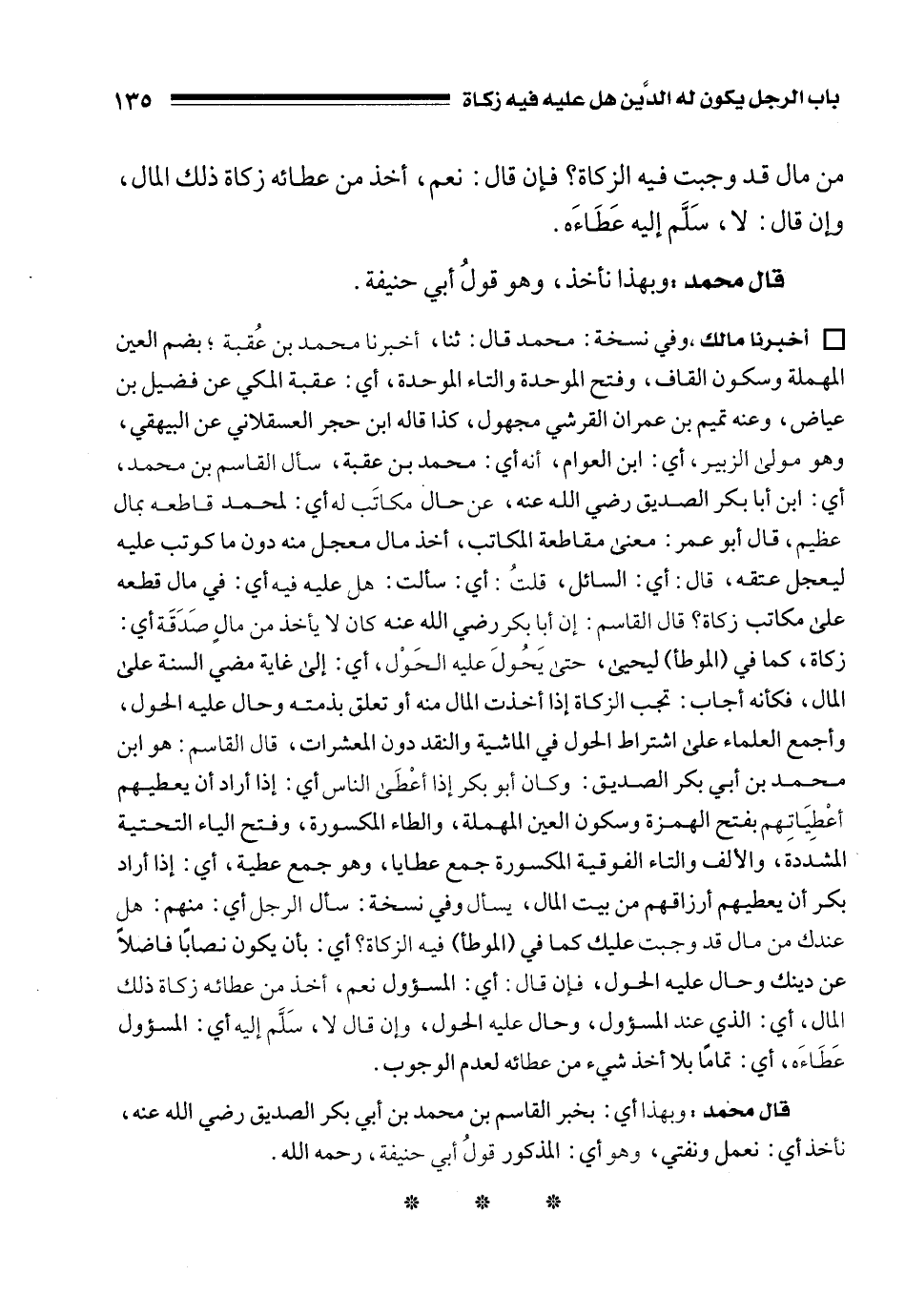 • أخبرنا مالك، وفي نسخة: محمد قال: ثنا، أخبرنا محمد بن عُقبة؛ بضم العين المهملة وسكون القاف، وفتح الموحدة والتاء الموحدة، أي: عقبة المكي عن فضيل بن عياض، وعنه تميم بن عمران القرشي مجهول، كذا قاله ابن حجر العسقلاني عن البيهقي، وهو مولى الزبير، أي: ابن العوام، أنه أي: محمد بن عقبة، سأل القاسم بن محمد، أي: ابن أبا بكر الصديق رضي الله عنه، عن حال مكاتَب له أي: لمحمد قاطعه بمال عظيم، قال أبو عمر: معنى مقاطعة المكاتب، أخذ مال معجل منه دون ما كوتب عليه ليعجل عتقه، قال: أي: السائل، قلتُ: أي: سألت: هل عليه فيه أي: في مال قطعه على مكاتب زكاة؟ قال القاسم: إن أبا بكر رضي الله عنه كان لا يأخذ من مالٍ صَدَقَة أي: زكاة، كما في (الموطأ) ليحيى، حتى يَحُولَ عليه الحَوْل، أي: إلى غاية مضي السنة على المال، فكأنه أجاب: تجب الزكاة إذا أخذت المال منه أو تعلق بذمته وحال عليه الحول، وأجمع العلماء على اشتراط الحول في الماشية والنقد دون المعشرات، قال القاسم: هو ابن محمد بن أبي بكر الصديق: وكان أبو بكر إذا أعْطَى الناس أي: إذا أراد أن يعطيهم أعْطِيَاتِهم بفتح الهمزة وسكون العين المهملة، والطاء المكسورة، وفتح الياء التحتية المشددة، والألف والتاء الفوقية المكسورة جمع عطايا، وهو جمع عطية، أي: إذا أراد بكر أن يعطيهم أرزاقهم من بيت المال، يسأل وفي نسخة: سأل الرجل أي: منهم: هل عندك من مال قد وجبت عليك كما في (الموطأ) فيه الزكاة؟ أي: بأن يكون نصابًا فاضلًا عن دينك وحال عليه الحول، فإن قال: أي: المسؤول نعم، أخذ من عطائه زكاة ذلك المال، أي: الذي عند المسؤول، وحال عليه الحول، وإن قال لا، سَلَّم إليه أي: المسؤول عَطَاءَه، أي: تمامًا بلا أخذ شيء من عطائه لعدم الوجوب.
