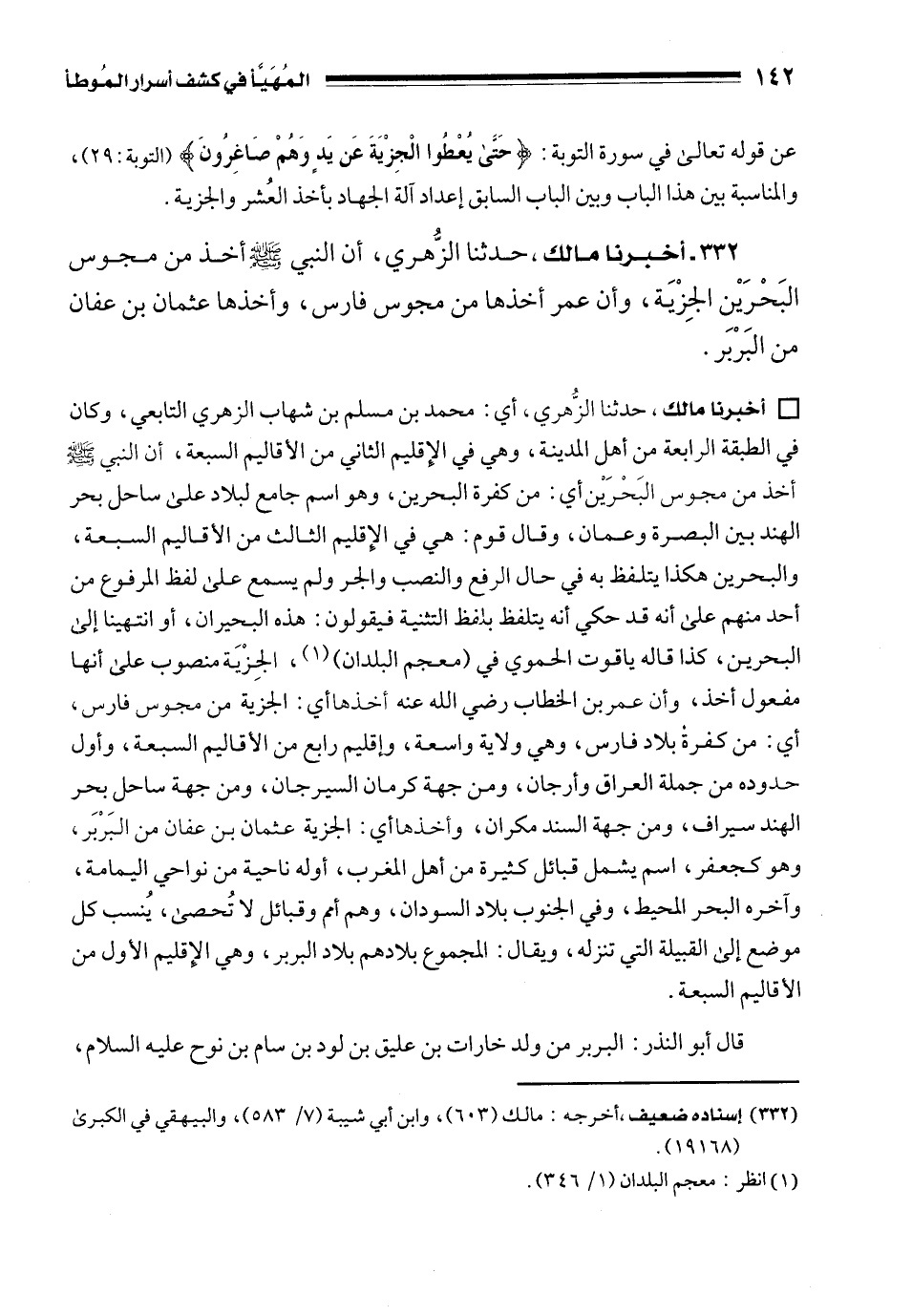332 - أخبرنا مالك، حدثنا الزُّهري، أن النبي - صلى الله عليه وسلم - أخذ من مجوس البَحْرَيْن الجِزْيَة، وأن عمر أخذها من مجوس فارس، وأخذها عثمان بن عفان من البَرْبَر.