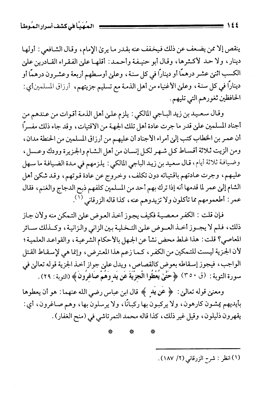 فإن قلت: الكفر معصية فكيف يجوز أخذ العوض على التمكن منه ولأن جاز ذلك، فلم لا يجوز أخذ العوض على التخلية بين الزاني والزانية، وكذلك سائر المعاصي؟ قلت: هذا غلط محض نشأ عن الجهل بالأحكام الشرعية، والقواعد العلمية؛ لأن الجزية ليست للتمكين من الكفر، كما زعم هذا المعترض، وإنما هي لإِسقاط القتل الواجب، فيجوز إسقاطه بعوض كالقصاص، وِيدل على جواز أخذ الجزية قوله تعالى في سورة التوبة: (ق 350) {حَتَّى يُعْطُوا الْجِزْيَةَ عَنْ يَدٍ وَهُمْ صَاغِرُونَ} [التوبة: 29].