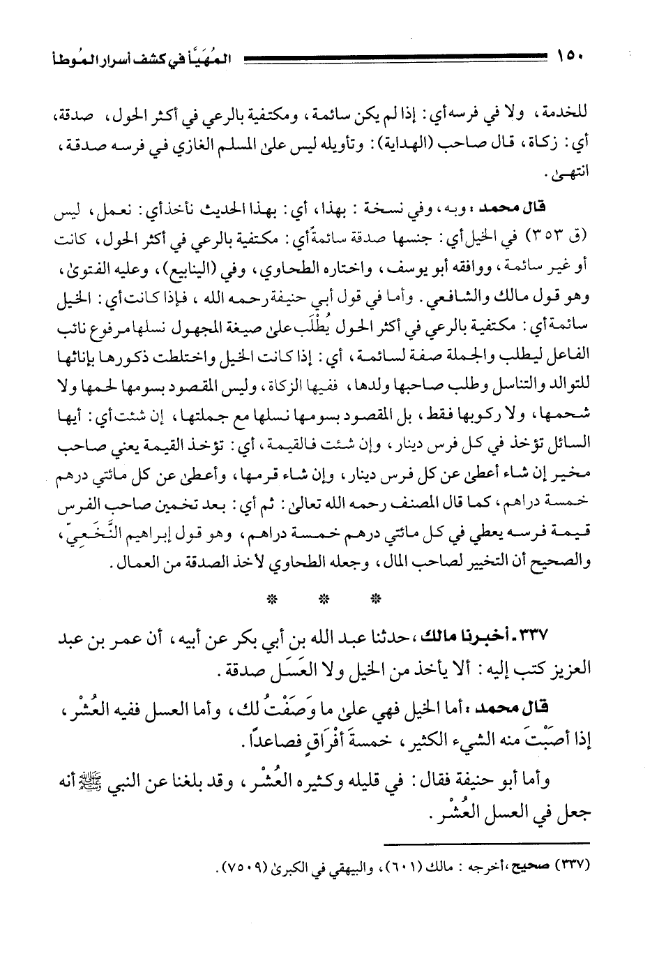 337 - أخبرنا مالك، حدثنا عبد الله بن أبي بكر عن أبيه، أن عمر بن عبد العزيز كتب إليه: ألا يأخذ من الخيل ولا العَسَل صدقة.