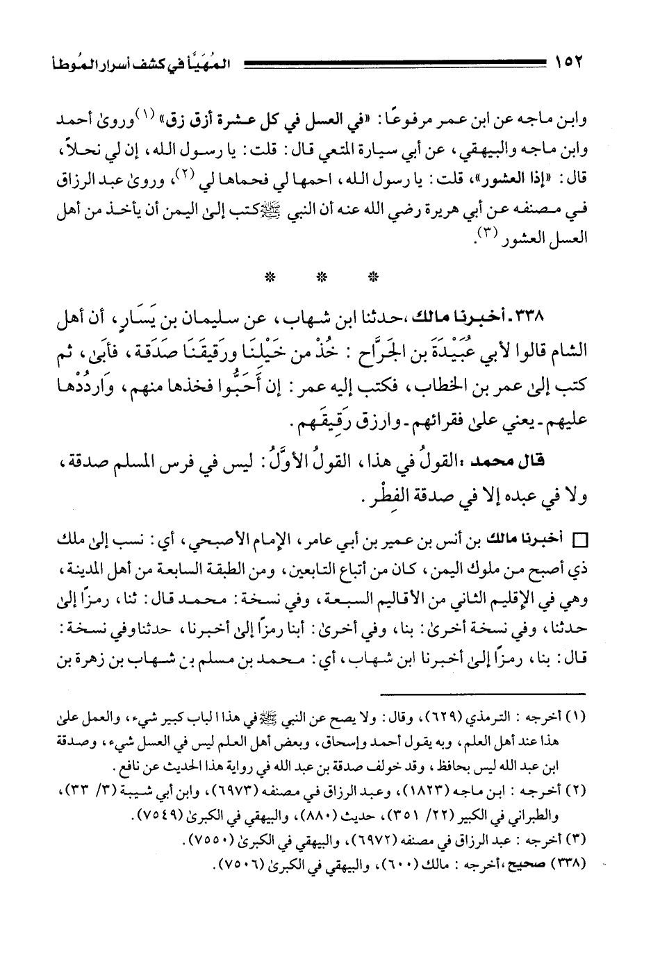338 - أخبرنا مالك، حدثنا ابن شهاب، عن سليمان بن يَسَارٍ، أن أهل الشام قالوا لأبي عُبَيْدَةَ بن الجَرَّاح: خُذْ من خَيْلِنَا ورَقيقَنَا صَدَقة، فأبَى، ثم كتب إلى عمر بن الخطاب، فكتب إليه عمر: إن أَحَبُّوا فخذها منهم، وَاردُدْها عليهم - يعني على فقرائهم - وارزق رَقِيقَهم.