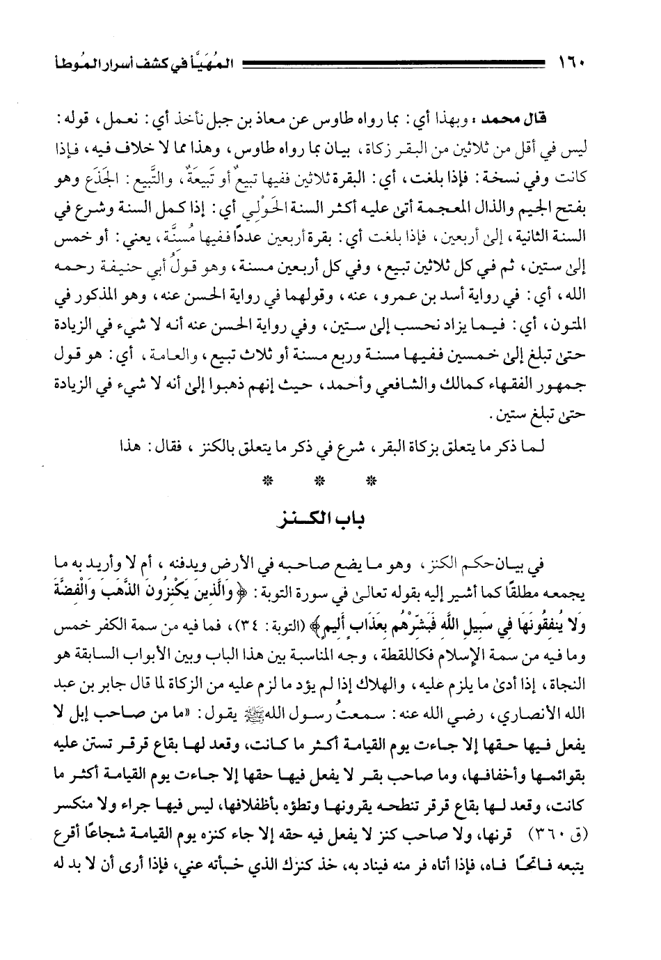في بيان حكم الكنز، وهو ما يضع صاحبه في الأرض ويدفنه، أم لا وأريد به ما يجمعه مطلقًا كما أشير إليه بقوله تعالى في سورة التوبة: {وَالَّذِينَ يَكْنِزُونَ الذَّهَبَ وَالْفِضَّةَ وَلَا يُنْفِقُونَهَا فِي سَبِيلِ اللَّهِ فَبَشِّرْهُمْ بِعَذَابٍ أَلِيمٍ} [التوبة: 34]، فما فيه من سمة الكفر خمس وما فيه من سمة الإِسلام فكاللقطة، وجه المناسبة بين هذا الباب وبين الأبواب السابقة هو النجاة، إذا أدى ما يلزم عليه، والهلاك إذا لم يؤد ما لزم عليه من الزكاة لما قال جابر بن عبد الله الأنصاري، رضي الله عنه: سمعتُ رسول الله - صلى الله عليه وسلم - يقول: "ما من صاحب إبل لا يفعل فيها حقها إلا جاءت يوم القيامة أكثر ما كانت، وقعد لها بقاع قرقر تستن عليه بقوائمها وأخفافها، وما صاحب بقر لا يفعل فيها حقها إلا جاءت يوم القيامة أكثر ما كانت، وقعد لها بقاع قرقر تنطحه بقرونها وتطؤه بأظلافها، ليس فيها جراء ولا منكسر (ق 360) قرنها، ولا صاحب كنز لا يفعل فيه حقه إلا جاء كنزه يوم القيامة شجاعًا أقرع يتبعه فاتحًا فاه، فإذا أتاه فر منه فيناد به، خذ كنزك الذي خبأته عني، فإذا أرى أن لا بد له