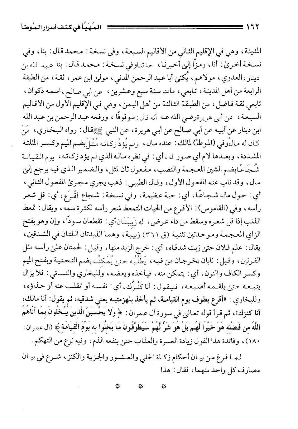 المدينة، وهي في الإِقليم الثاني من الأقاليم السبعة، وفي نسخة: محمد قال: بنا، وفي نسخة أخرى: أنا، رمزًا إلى أخبرنا، حدثنا وفي نسخة: محمد قال: بنا عبد الله بن دينار، العدوي، مولاهم، يُكنى أبا عبد الرحمن المدني، مولى ابن عمر، ثقة، من الطبقة الرابعة من أهل المدينة، تابعي، مات سنة سبع وعشرين، عن أبي صالح، اسمه ذكوان، تابعي ثقة فاضل، من الطبقة الثالثة من أهل اليمن، وهي في الإِقليم الأول من الأقاليم السبعة، عن أبي هريرة رضي الله عنه أنه قال: موقوفًا، ورفعه عبد الرحمن بن عبد الله بن دينار عن أبيه عن أبي صالح عن أبي هريرة، عن النبي - صلى الله عليه وسلم - قال: رواه البخاري، مَنْ كان له مالٌ وفي (الموطأ) لمالك: عنده مال، ولم يُؤدِّ زكاته مُثِّلَ بضم الميم وكسر المثلثة المشددة، وبعدها لام أي صور له، أي: في نظره ماله الذي لم يؤد زكاته، يوم القيامة شُجَاعًا بضم الشين المعجمة والنصب، مفعول ثان لمثل، والضمير الذي فيه يرجع إلى مال، وقد ناب عنه المفعول الأول، وقال الطيبي: ذهب يجري مجرى المفعول الثاني، أي: حول ماله شجاعًا، أي: حية عظيمة، وفي نسخة: شجاع أقْرَع، أي: قل شعر رأسه، وفي (القاموس): الأقرع من الحيات المتمعط شعر رأسه لكثرة سمه، ويقال: تمعط الذنب إذا قل شعره وسقط من داء عرض، له زَبِيبَتَان أي: تقطعان سودًا، وإن وهو بفتح الزاي المعجمة وموحدتين تثنية (ق 361) زبيبة، وهما الذبدتان اللتان في الشدقين، يقال: علم فلان حتى زبت شدقاه، أي: خرج الزبد منها، وقيل: لحمتان على رأسه مثل القرنين، وقيل: نابان يخرجان من فيه، يَطْلُبُه حتى يُمَكِنُه بضم التحتية وبفتح الميم وكسر الكاف والنون، أي: يتمكن منه، فيأخذه ويعضه، وَللبخاري والنسائي: فلا يزال يتبعه حتى يلقمه أصبعه، فيقول: أنا كَنْزُك، أي: نفسه أو انقلب عنه أو حذاؤه، وللبخاري: "أقرع يطوف يوم القيامة، ثم يأخذ بلهزمتيه يعني شدقيه، ثم يقول: أنا مالك، أنا كنزك"، ثم قرأ قوله تعالى في سورة آل عمران: {وَلَا يَحْسَبَنَّ الَّذِينَ يَبْخَلُونَ بِمَا آتَاهُمُ اللَّهُ مِنْ فَضْلِهِ هُوَ خَيْرًا لَهُمْ بَلْ هُوَ شَرٌّ لَهُمْ سَيُطَوَّقُونَ مَا بَخِلُوا بِهِ يَوْمَ الْقِيَامَةِ} [آل عمران: 180]، وفائدة هذا القول زيادة العسرة والعذاب حتى ينفعه الذم، وفيه نوع من التهكم.
