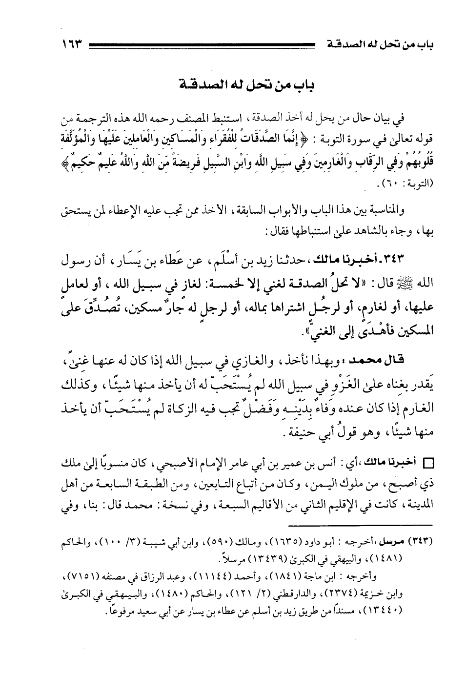 343 - أخبرنا مالك، حدثنا زيد بن أسْلَم، عن عَطاء بن يَسَار، أن رسول الله - صلى الله عليه وسلم - قال: "لا تحلُ الصدقة لغني إلا لخمسة: لغازٍ في سبيل الله، أو لعاملٍ عليها، أو لغارمٍ، أو لرجُلٍ اشتراها بماله، أو لرجلٍ له جارٌ مسكين، تُصُدِّقَ على المسكين فأهْدَى إلى الغنيّ".