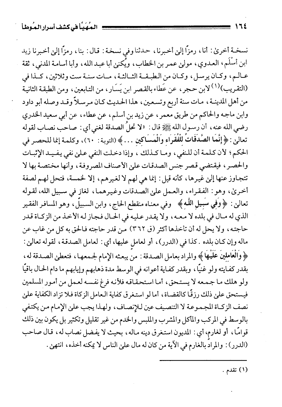 نسخة أخرى: أنا، رمزًا إلى أخبرنا، حدثنا وفي نسخة: قال: بنا، رمزًا إلى أخبرنا زيد بن أسْلَم، العدوي، مولى عمر بن الخطاب، ويُكنى أبا عبد الله، وأبا أسامة المدني، ثقة عالم، وكان يرسل، وكان من الطبقة الثالثة، مات سنة ست وثلاثين، كذا في (التقريب) (¬1) لابن حجر، عن عَطاء بالقصر ابن يَسَار، من التابعين، ومن الطبقة الثانية من أهل المدينة، مات سنة أربع وتسعين، هذا الحديث كان مرسلًا وقد وصله أبو داود وابن ماجه والحاكم من طريق معمر، عن زيد بن أسلم، عن عطاء، عن أبي سعيد الخدري رضي الله عنه، أن رسول الله - صلى الله عليه وسلم - قال: "لا تحلُ الصدقة لغني أي: صاحب نصاب لقوله تعالى: {إِنَّمَا الصَّدَقَاتُ لِلْفُقَرَاءِ وَالْمَسَاكِينِ ...} [التوبة: 60]، وكلمة إنما للحصر في الحكم؛ لأن كلمة أن للنفي، وما كذلك، وإذا دخلت النفي على نفي يفيد الإثبات والحصر، فيقتضي قصر جنس الصدقات على الأصناف المصروفة، وأنها مختصة بها لا تتجاوز عنها إلى غيرها، كأنه قيل: إنما هي لهم لا لغيرهم، إلا لخمسة، فتحل لهم لصفة أخرى، وهو: الفقراء، والعمل على الصدقات وغيرهما، لغازٍ في سبيل الله، لقوله تعالى: {وَفِي سَبِيلِ اللَّهِ} وفي معناه منقطع الحاج، وابن السبيل، وهو المسافر الفقير الذي له مال في بلده لا معه، ولا يقدر عليه في الحال فجاز له الأخذ من الزكاة قدر حاجته، ولا يحل له أن تأخذها أكثر (ق 362) من قدر حاجته فالحق به كل من غاب عن ماله وإن كان بلده. كذا في (الدرر)، أو لعاملٍ عليها، أي: لعامل الصدقة، لقوله تعالى: {وَالْعَامِلِينَ عَلَيْهَا} والمراد بعامل الصدقة: من يبعثه الإِمام لجمعها، فتعطى الصدقة، بقدر كفايته ولو غنيًا، وبقدر كفاية أعوانه في الوسط مدة ذهابهم وإيابهم ما دام الحال باقيًا ولو هلك ما جمعه لا يستحق، أما استحقاقه فلأنه فرغ نفسه لعمل من أمور المسلمين فيستحق على ذلك رزقًا كالقضاة، أما لو استغرق كفاية العامل الزكاة فلا تزاد الكفاية على نصف الزكاة المجموعة لا التنصيف عين للإِنصاف، ولهذا يجب على الإِمام من يكتفي بالوسط في المركب والمأكل والمشرب والملبس والخدم من غير تقليل وتكثير بل يكون بين ذلك قوامًا، أو لغارمٍ، أي: المديون استغرق دينه ماله، بحيث لا يفضل نصاب له، قال صاحب (الدرر): والمراد بالغارم في الآية من كان له مال على الناس لا يمكنه أخذه، انتهى.