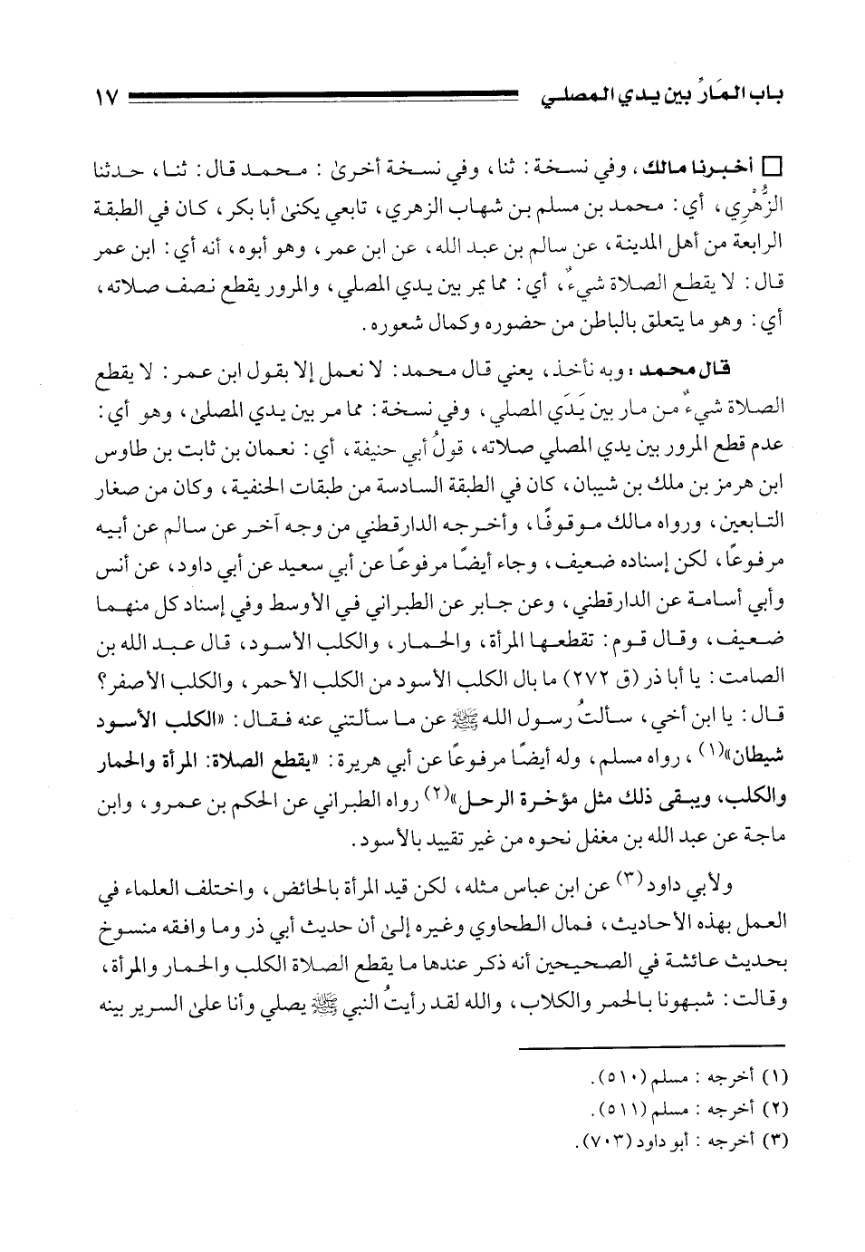 • أخبرنا مالك, وفي نسخة: ثنا، وفي نسخة أخرى: محمد قال: ثنا، حدثنا الزُّهْرِي، أي: محمد بن مسلم بن شهاب الزهري، تابعي يكنى أبا بكر، كان في الطبقة الرابعة من أهل المدينة، عن سالم بن عبد الله، عن ابن عمر، وهو أبوه، أنه أي: ابن عمر قال: لا يقطع الصلاة شيءٌ، أي: مما يمر بين يدي المصلي، والمرور يقطع نصف صلاته، أي: وهو ما يتعلق بالباطن من حضوره وكمال شعوره.