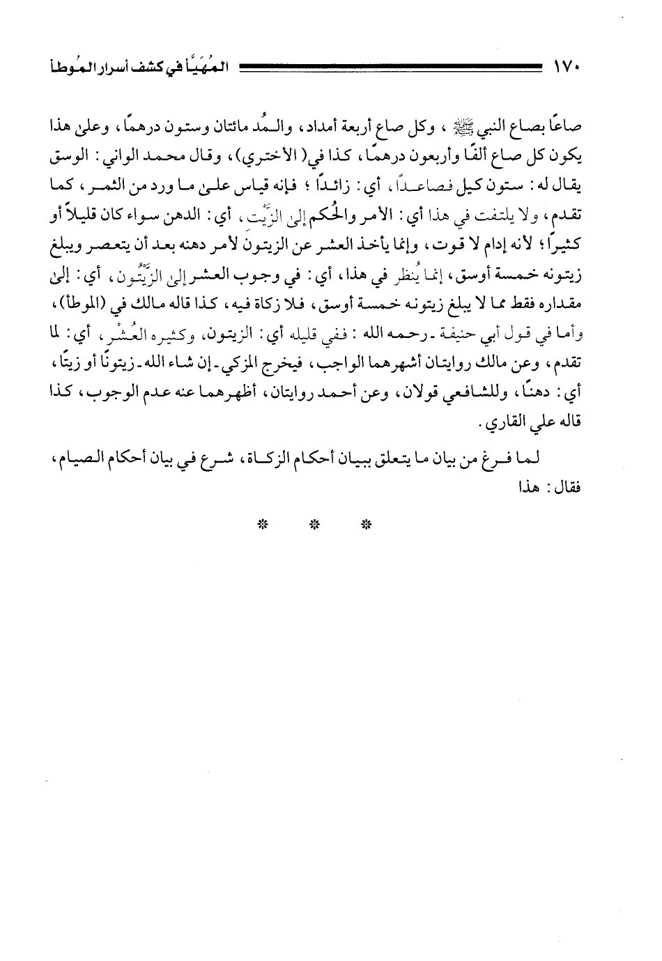 صاعًا بصاع النبي - صلى الله عليه وسلم -، وكل صاع أربعة أمداد، والمُد مائتان وستون درهمًا، وعلى هذا يكون كل صاع ألفًا وأربعون درهمًا، كذا في (الأختري)، وقال محمد الواني: الوسق يقال له: ستون كيل فصاعدًا، أي: زائدًا؛ فإنه قياس على ما ورد من الثمر، كما تقدم، ولا يلتفت في هذا أي: الأمر والحُكم إلى الزَّيْتِ، أي: الدهن سواء كان قليلًا أو كثيرًا؛ لأنه إدام لا قوت، وإنما يأخذ العشر عن الزيتون لأمر دهنه بعد أن يتعصر ويبلغ زيتونه خمسة أوسق، إنما يُنظر في هذا، أي: في وجوب العشر إلى الزَّيْتُون، أي: إلى مقداره فقط مما لا يبلغ زيتونه خمسة أوسق، فلا زكاة فيه، كذا قاله مالك في (الموطأ)، وأما في قول أبي حنيفة - رحمه الله: ففي قليله أي: الزيتون، وكثيره العُشْر، أي: لما تقدم، وعن مالك روايتان أشهرهما الواجب، فيخرج المزكي - إن شاء الله - زيتونًا أو زيتًا، أي: دهنًا، وللشافعي قولان، وعن أحمد روايتان، أظهرهما عنه عدم الوجوب، كذا قاله علي القاري.