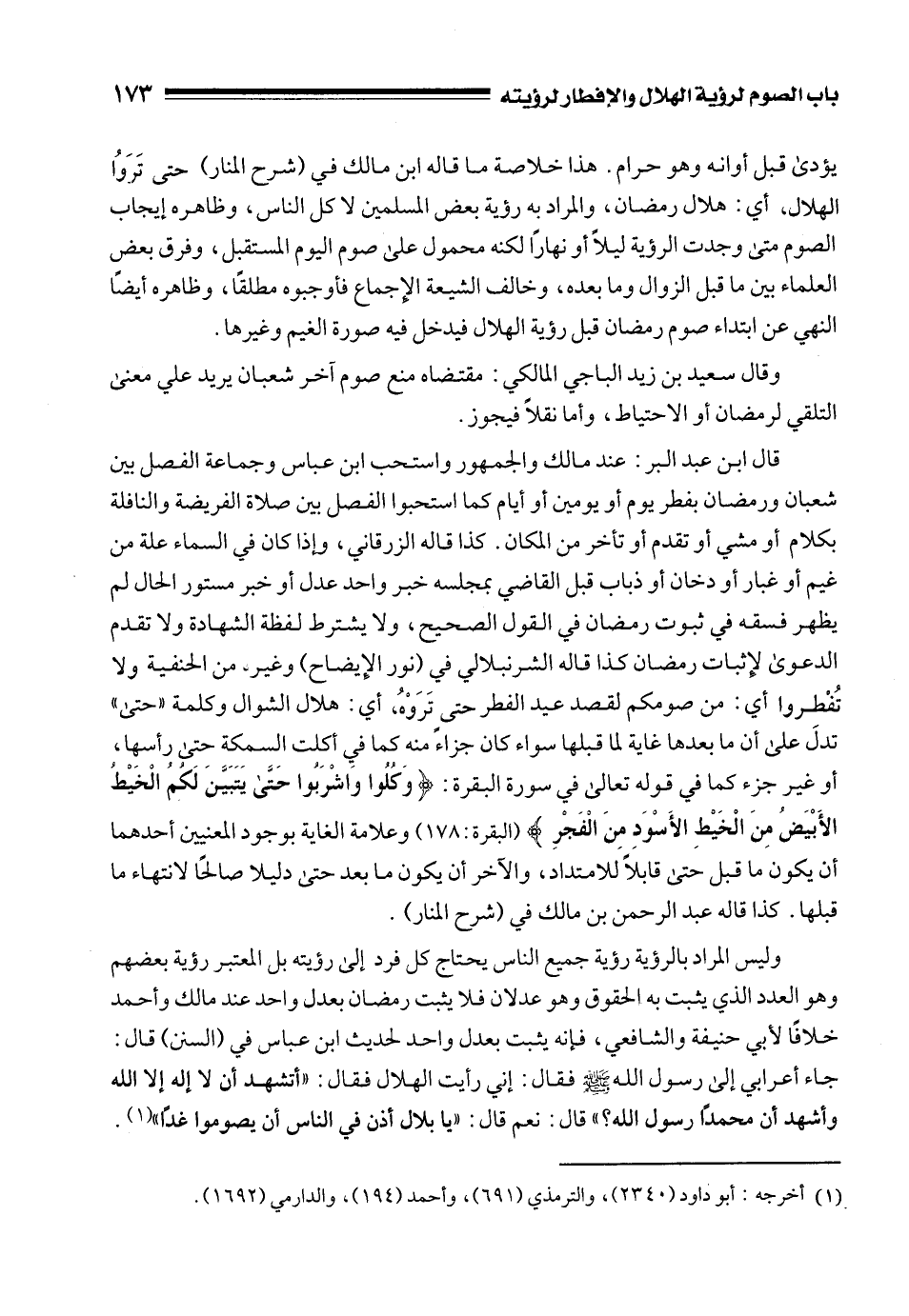 يؤدى قبل أوانه وهو حرام. هذا خلاصة ما قاله ابن مالك في (شرح المنار) حتى تَرَوُا الهلال، أي: هلال رمضان، والمراد به رؤية بعض المسلمين لا كل الناس، وظاهره إيجاب الصوم متى وجدت الرؤية ليلًا أو نهارًا لكنه محمول على صوم اليوم المستقبل، وفرق بعض العلماء بين ما قبل الزوال وما بعده، وخالف الشيعة الإِجماع فأوجبوه مطلقًا، وظاهره أيضًا النهي عن ابتداء صوم رمضان قبل رؤية الهلال فيدخل فيه صورة الغيم وغيرها.