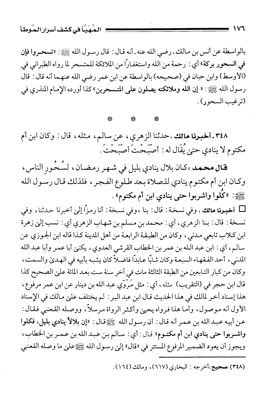 • أخبرنا مالك، وفي نسخة: قال: بنا، وفي نسخة: أنا رمزًا إلى أخبرنا حدثنا، وفي نسخة: قال: بنا الزهري، أي: محمد بن مسلم بن شهاب الزهري أي: نسب إلى زهرة بن كلاب تابعي مدني، وكان من الطبقة الرابعة من أهل المدينة كذا قاله ابن الجوزي عن سالم، أي: ابن عبد الله بن عمر بن الخطاب القرشي العدوي، يكنى أبا عمر وأبا عبد الله المدني، أحد الفقهاء السبعة وكان شابًا عابدًا فاضلًا كان يشبه بأبيه في الهدى والسمت، وكان من كبار التابعين من الطبقة الثالثة مات في آخر سنة ست بعد المائة على الصحيح كذا قال ابن حجر في (التقريب) مثله، أي: مثل مَرْوّي عبد الله بن دينار عن ابن عمر مرفوع، هذا إسناد آخر لمالك في هذا الحديث قال ابن عبد البر: لم يختلف على مالك في الإِسناد الأول أنه موصول، وأما هذا فرواه يحيى وأكثر الرواة مرسلًا، ووصله القعنبي فقال: عن أبيه عبد الله بن عمر أنه قال: أن رسول الله - صلى الله عليه وسلم - قال: "إن بلالًا ينادي بليل، فكلوا واشربوا حتى ينادي ابن أم مكتوم" قال: أي: سالم بن عبد الله بن عمر بن الخطاب، ويجوز أن يعود الضمير المرفوع المستتر في "قال" إلى رسول الله - صلى الله عليه وسلم - على ما وصله القعنبي