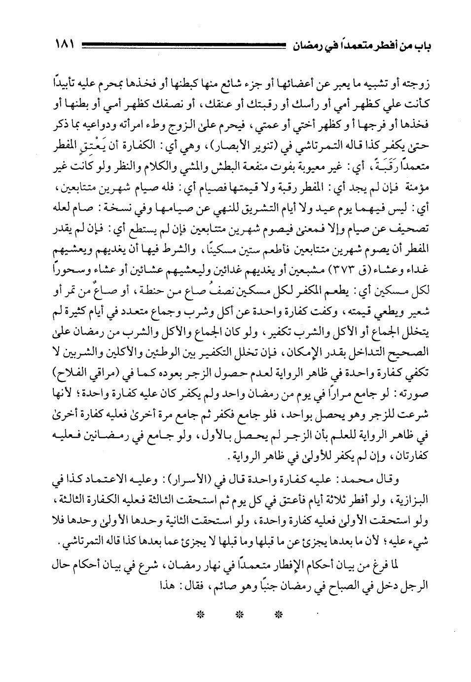 زوجته أو تشبيه ما يعبر عن أعضائها أو جزء شائع منها كبطنها أو فخذها بمحرم عليه تأبيدًا كأنت علي كظهر أمي أو رأسك أو رقبتك أو عنقك، أو نصفك كظهر أمي أو بطنها أو فخذها أو فرجها أو كظهر أختي أو عمتي، فيحرم على الزوج وطء امرأته ودواعيه بما ذكر حتى يكفر كذا قاله التمرتاشي في (تنوير الأبصار)، وهي أي: الكفارة أن يَعْتِقِ المفطر متعمدًا رَقَبَةً، أي: غير معيوبة بفوت منفعة البطش والمشي والكلام والنظر ولو كانت غير مؤمنة فإن لم يجد أي: المفطر رقبة ولا قيمتها فصيام أي: فله صيام شهرين متتابعين، أي: ليس فيهما يوم عيد ولا أيام التشريق للنهي عن صيامها وفي نسخة: صام لعله تصحيف عن صيام وإلا فمعنى فيصوم شهرين متتابعين فإن لم يستطع أي: فإن لم يقدر المفطر أن يصوم شهرين متتابعين فأطعم ستين مسكينًا، والشرط فيها أن يغديهم ويعشيهم غداء وعشاء (ق 373) مشبعين أو يغديهم غدائين وليعشيهم عشائين أو عشاء وسحورًا لكل مسكين أي: يطعم المكفر لكل مسكين نصفُ صاع من حنطة، أو صاعٌ من تمر أو شعير ويعطي قيمته، وكفت كفارة واحدة عن أكل وشرب وجماع متعدد في أيام كثيرة لم يتخلل الجماع أو الأكل والشرب تكفير، ولو كان الجماع والأكل والشرب من رمضان على الصحيح التداخل بقدر الإِمكان، فإن تخلل التكفير بين الوطئين والأكلين والشربين لا تكفي كفارة واحدة في ظاهر الرواية لعدم حصول الزجر بعوده كما في (مراقي الفلاح) صورته: لو جامع مرارًا في يوم من رمضان واحد ولم يكفر كان عليه كفارة واحدة؛ لأنها شرعت للزجر وهو يحصل بواحد، فلو جامع فكفر ثم جامع مرة أخرى فعليه كفارة أخرى في ظاهر الرواية للعلم بأن الزجر لم يحصل بالأول، ولو جامع في رمضانين فعليه كفارتان، وإن لم يكفر للأولى في ظاهر الرواية.